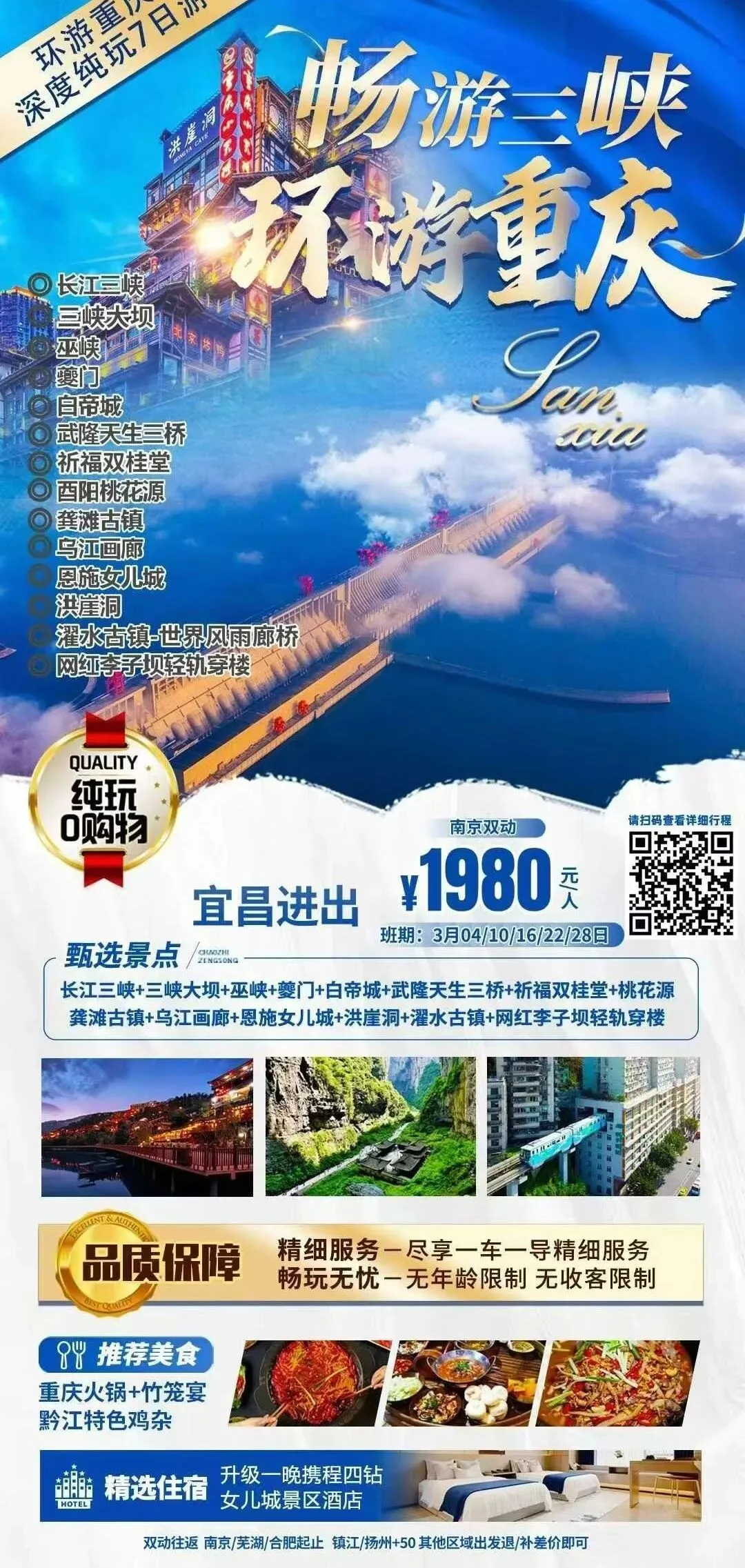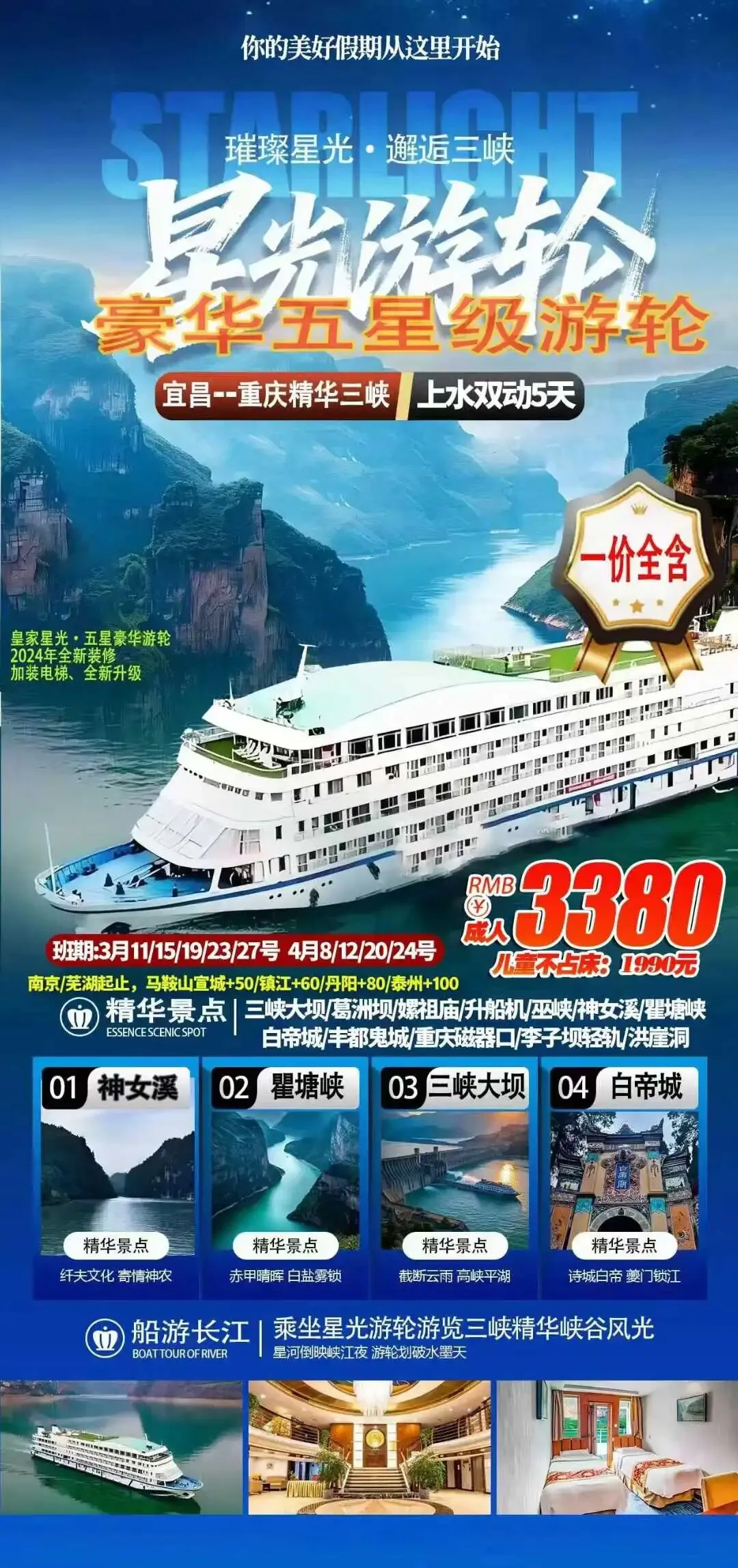🔶精华景点:三峡大坝、三峡人家、小三峡、白帝城、升船机、西陵峡、巫峡、瞿塘峡