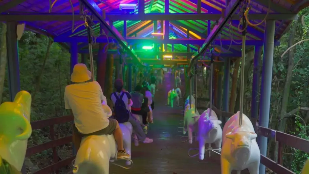 设备外观以憨态可掬的水牛为主题,座舱嵌入水牛背部,游客乘坐时仿佛被“驮着”穿行山林。这种设计增强了亲子互动性,缓解孩子因枯燥而产生的焦虑,同时满足年轻人拍照打卡需求。