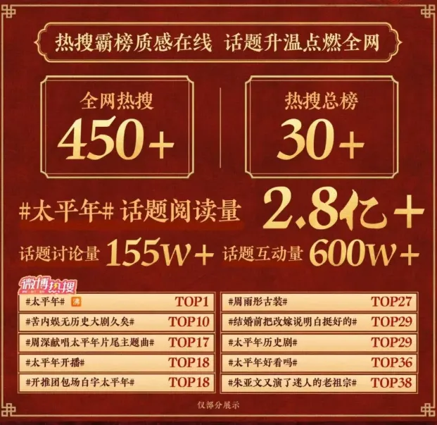 近日,重大历史题材剧《太平年》正式开播,首播即获得爱奇艺等电视剧热搜榜TOP1,微博主话题#太平年#阅读量突破2.8亿,讨论量超155万,累计登上热搜超450次,其中30次冲入热搜总榜。