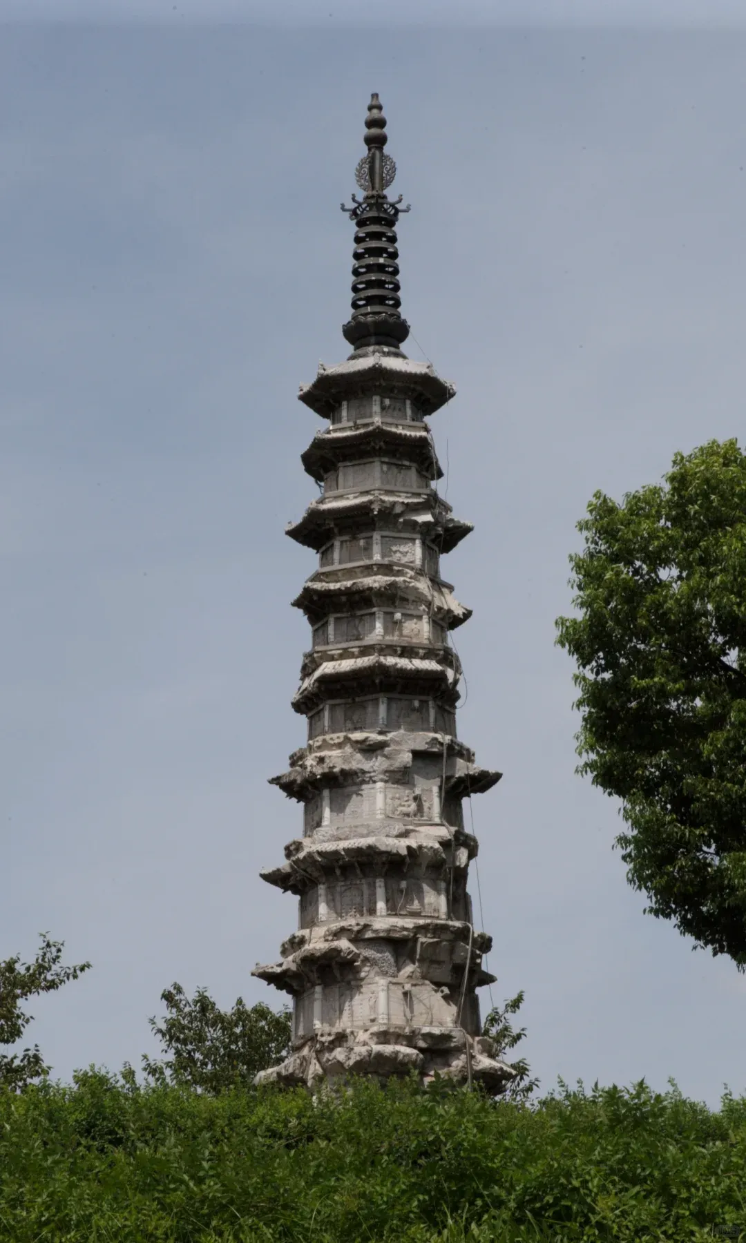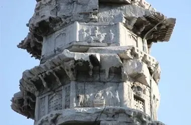 塔的最下边是基座,雕刻有山峰、海浪等纹饰,象征着“九山八海”,其上立有须弥座。塔座的束腰上刻有佛经,再上分为九层,每层由塔身、塔檐和平座三部分组成,塔身上浮雕有佛、菩萨等,人物形象刻画生动,惟妙惟肖。
