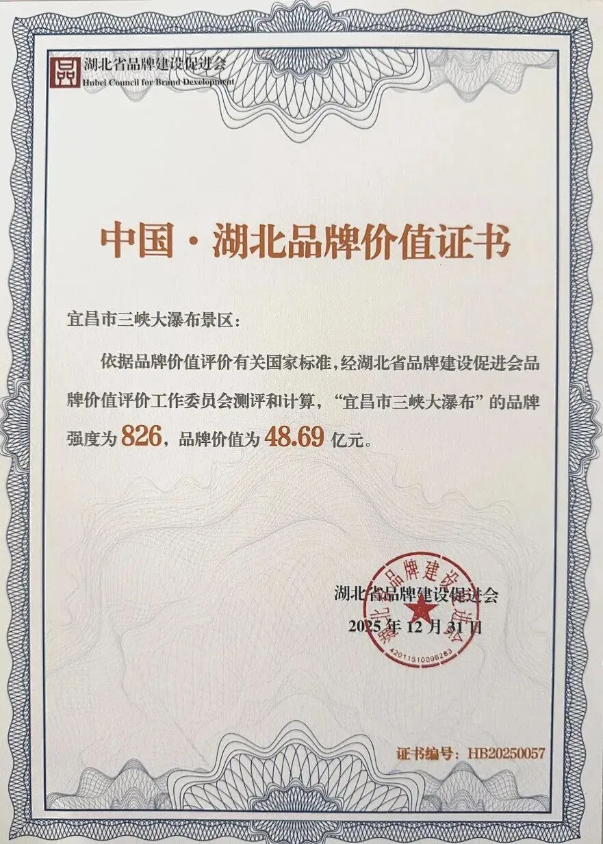 会上正式发布2025年湖北品牌价值评价结果,位于宜昌市夷陵区黄花镇的三峡大瀑布景区凭借扎实的品牌实力,以品牌强度826、品牌价值48.69亿元荣获“中国·湖北省品牌价值证书”。