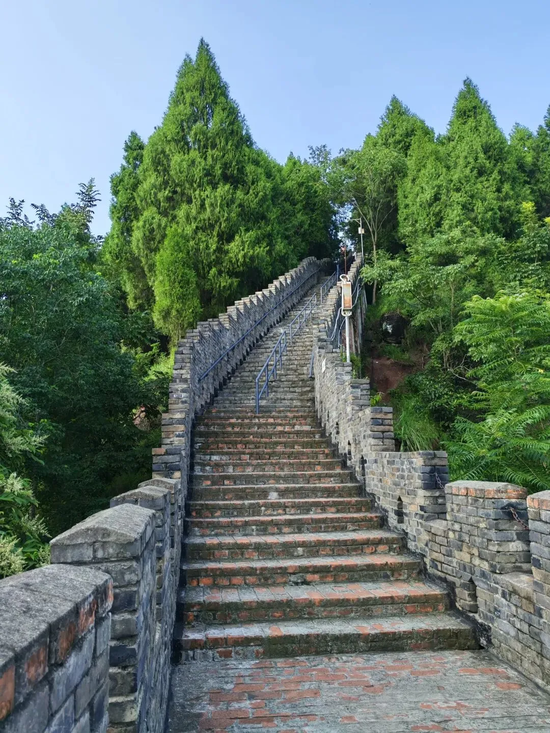 金龙长城全长1680米,落差达260米,有五座烽火台,还设有女墙、垛口等,像是个缩小版的长城模型。前三个烽火台之间最难爬,连续陡阶,站在中间向上看高耸入云,向下看有些恐高腿软,不由得抓紧了两侧的栏杆。这么陡峭的台阶下雨天是万万不能来爬的,台阶里面还有一点点苔藓,万一脚滑滚下去不堪设想。