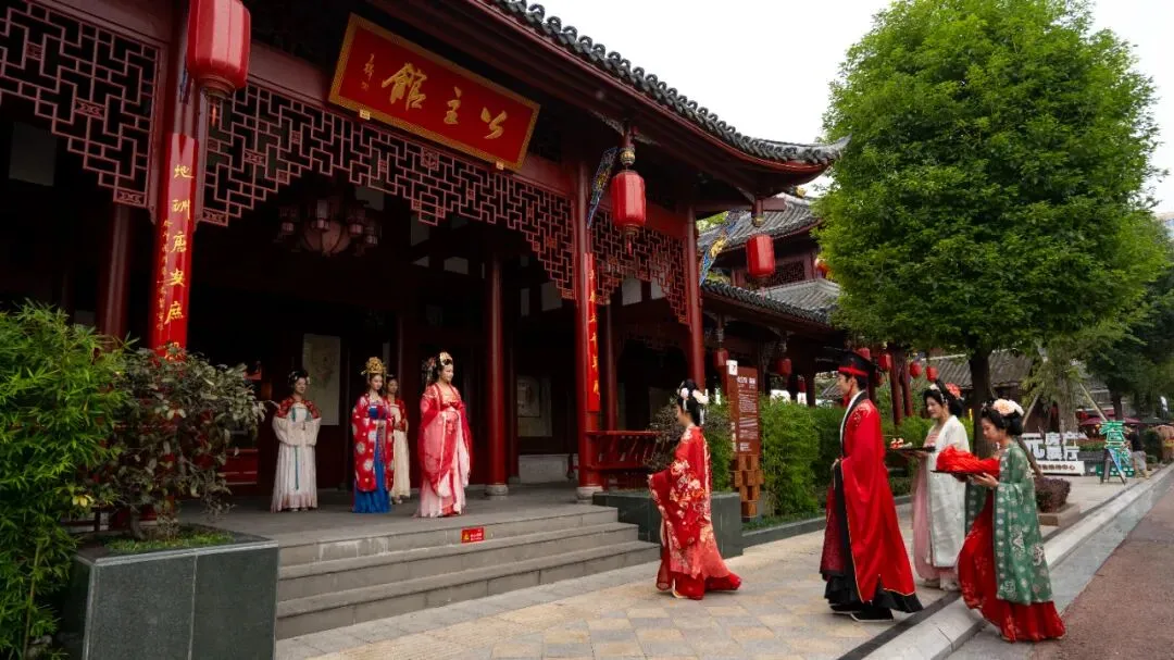 “唐风蜀韵”顾名思义,即以唐代蜀州(今崇州)建立以来的历史文化为背景,以崇州“蜀中之蜀”特殊的地域文化为依托,通过文化展示、建筑和园林景观营造、业态布局而形成的集崇州历史文化、建筑文化、民俗文化、非遗文化和园林景观为一体的文化旅游和度假休闲景区。是成都唐人街项目核心区域。