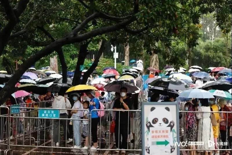4月29日上午,广州动物园熊猫馆门外雨中排队的游客