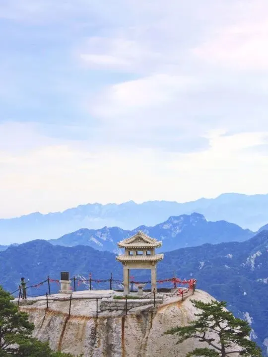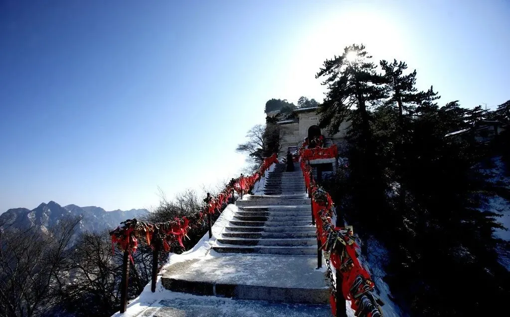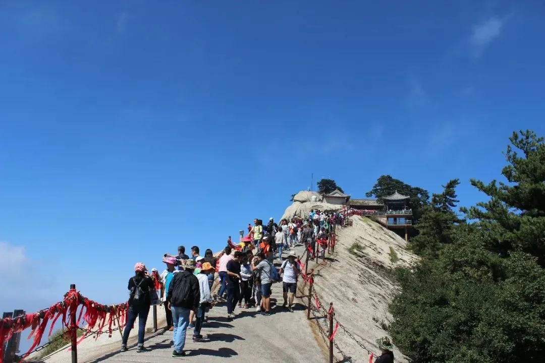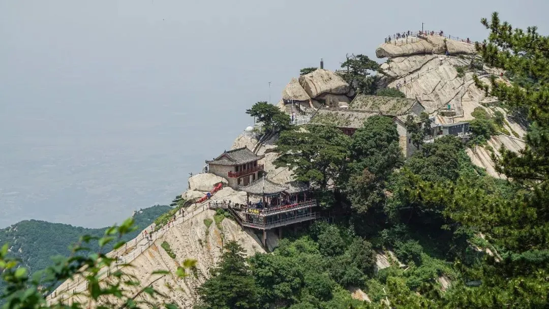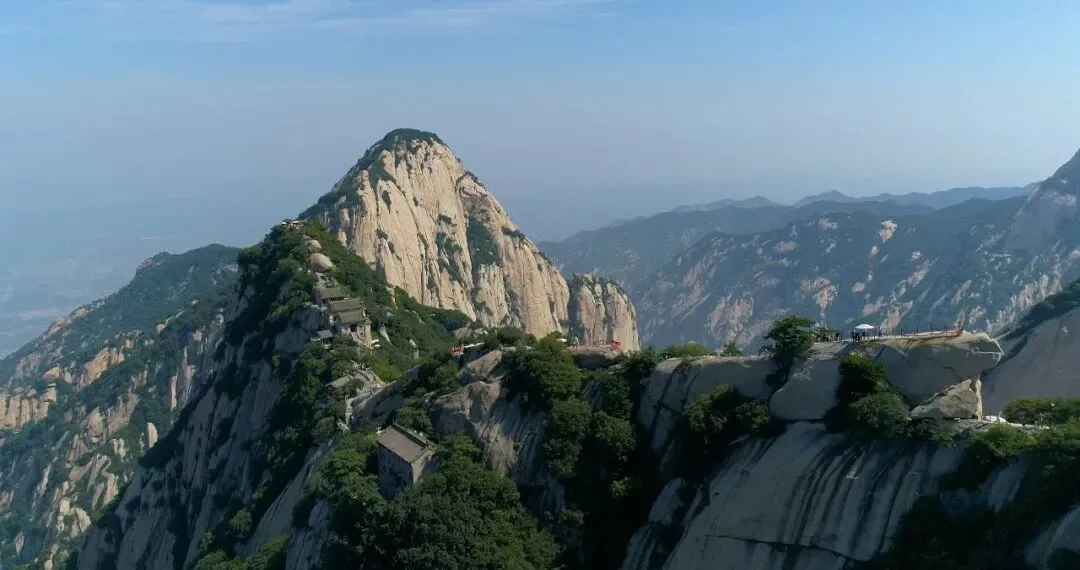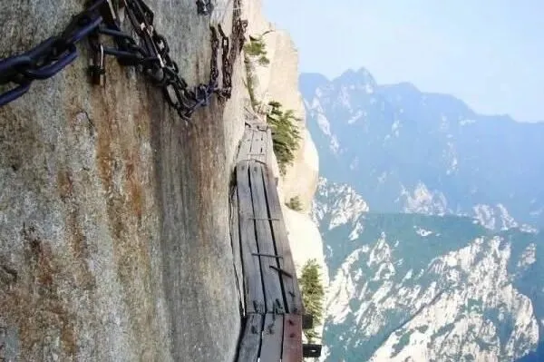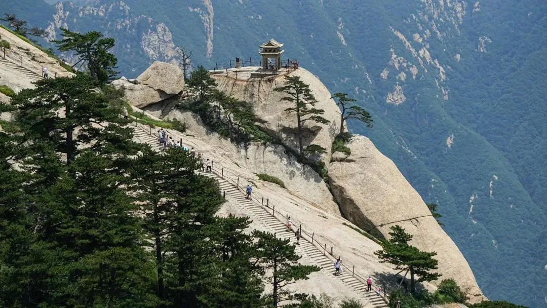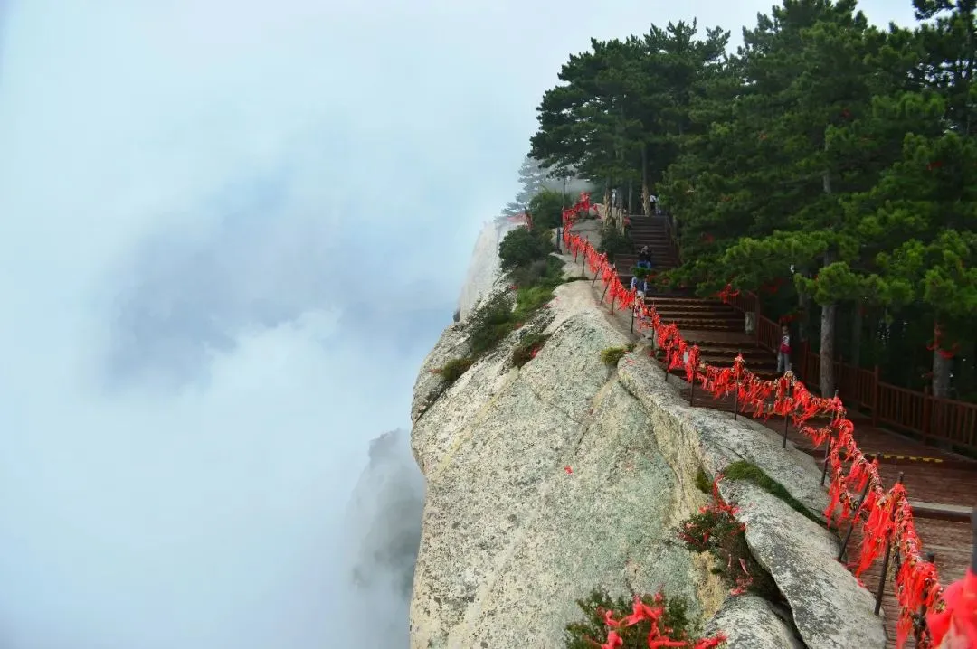 华山的著名景区多达210余处,有凌空架设的长空栈道,三面临空的鹞(yào)子翻身,以及在峭壁绝崖上凿出的千尺幢、百尺峡、老君犁沟等。