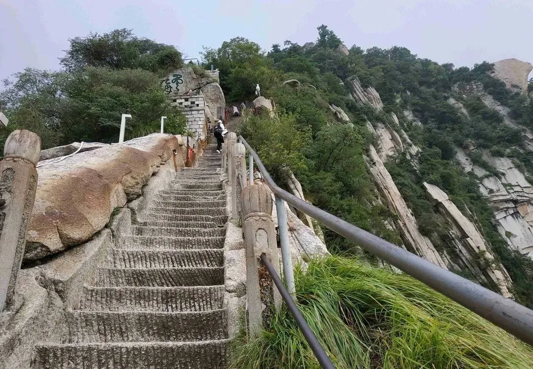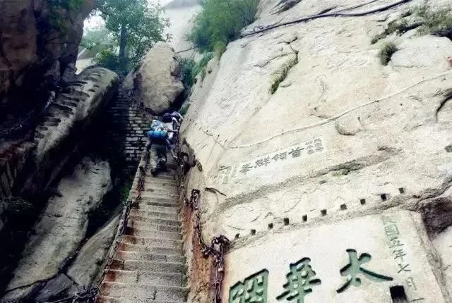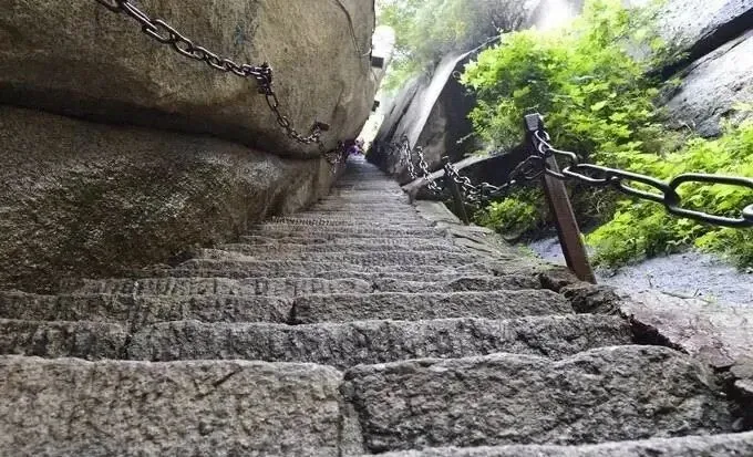 其山幢壁直立,坡度极陡,仅容二人上下穿行。两边铁链垂直下垂,从上至下共有370多个台阶,每级台阶的宽度约为三分之一的脚掌宽,十分惊险。