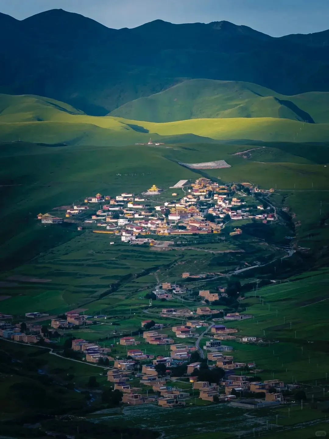 特色:弯弯的小河,傍水而居的小村庄,白云朵朵,绿草如茵,经幡飘扬。
