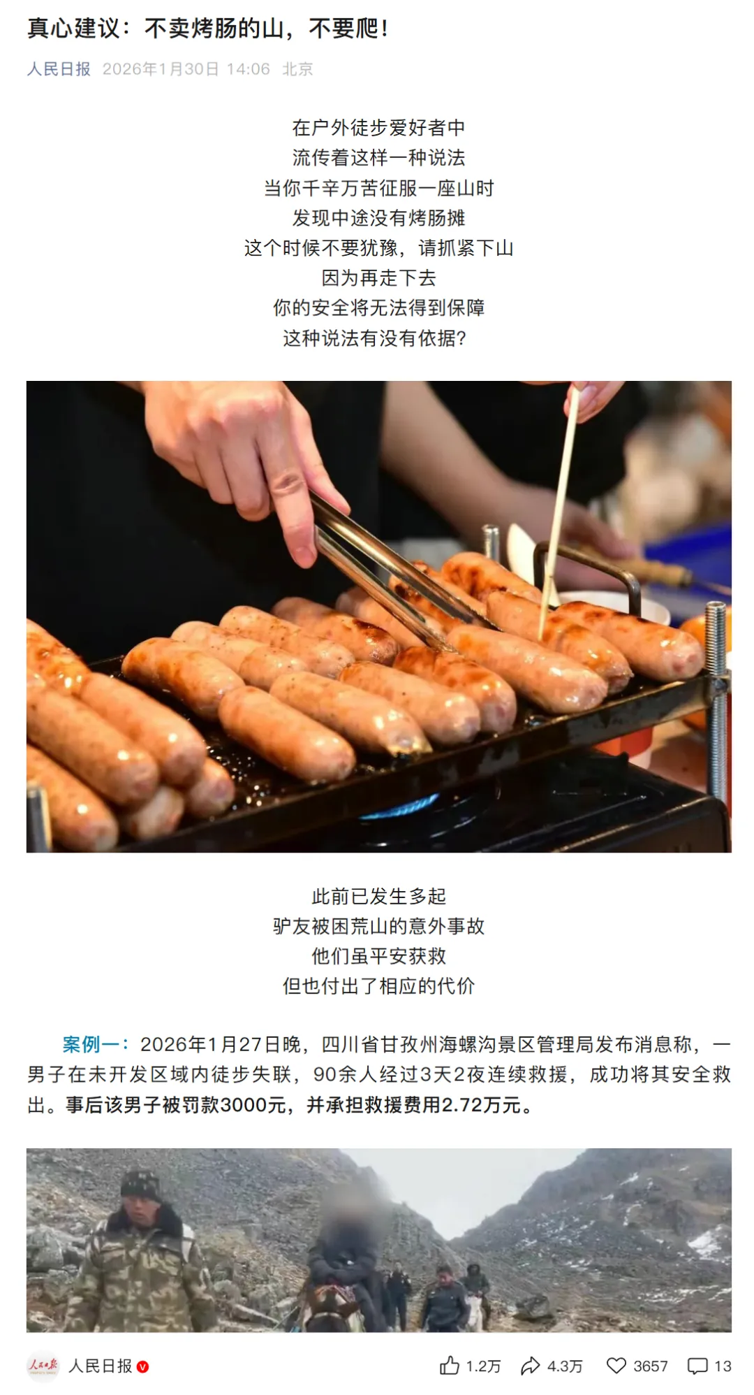 案例一:2026年1月27日晚,四川省甘孜州海螺沟景区管理局发布消息称,一男子在未开发区域内徒步失联,90余人经过3天2夜连续救援,成功将其安全救出。事后该男子被罚款3000元,并承担救援费用2.72万元。