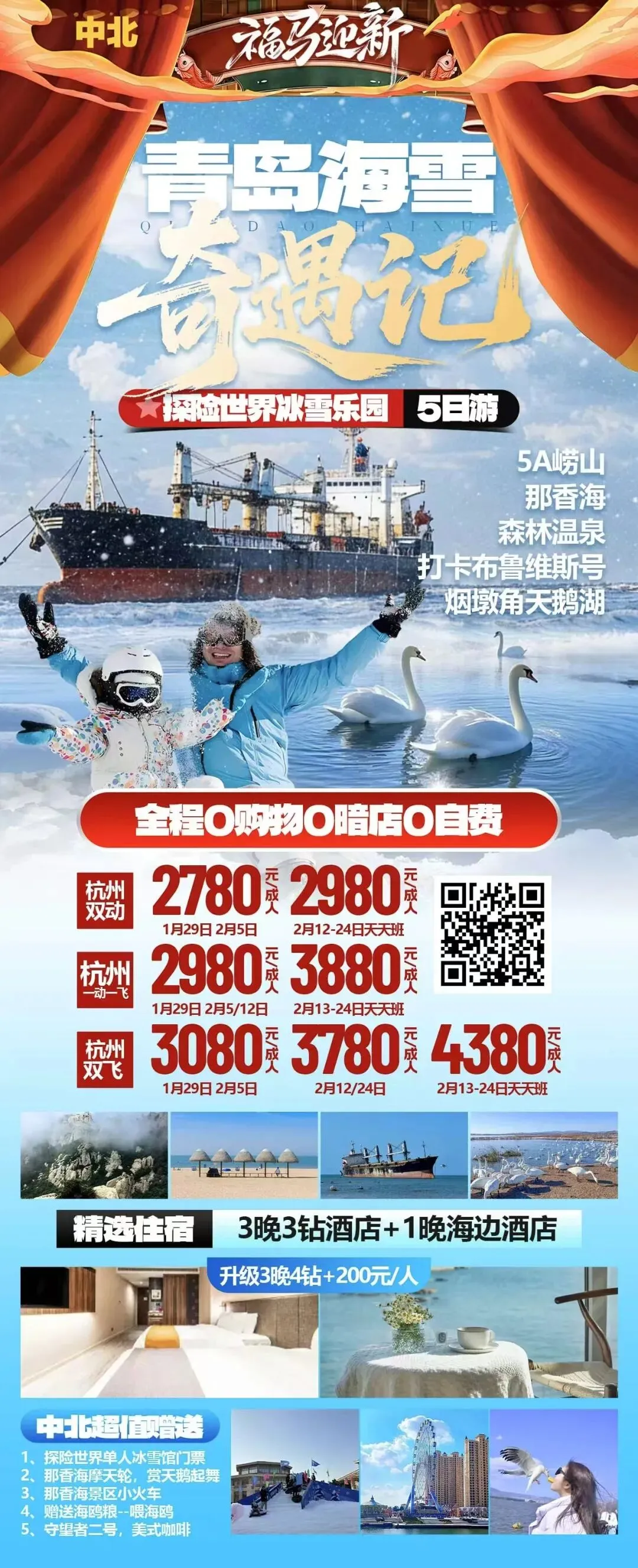 游崂山,泡温泉,追天鹅、喂海鸥、品咖啡、玩冰雪