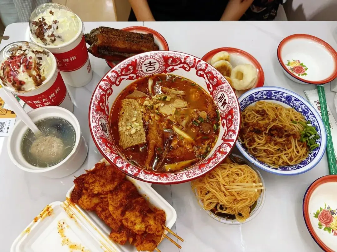 一元白糖糕、三元南昌拌粉、四元瓦罐汤、两元三个绿豆饼、十元三串的油茶炸大里脊、五元变态辣藕片、七元糯叽叽麻糍油条、10元洪都大拇指奶茶……物价感人,种类不一,铺陈在餐桌上慢慢分享品尝。
