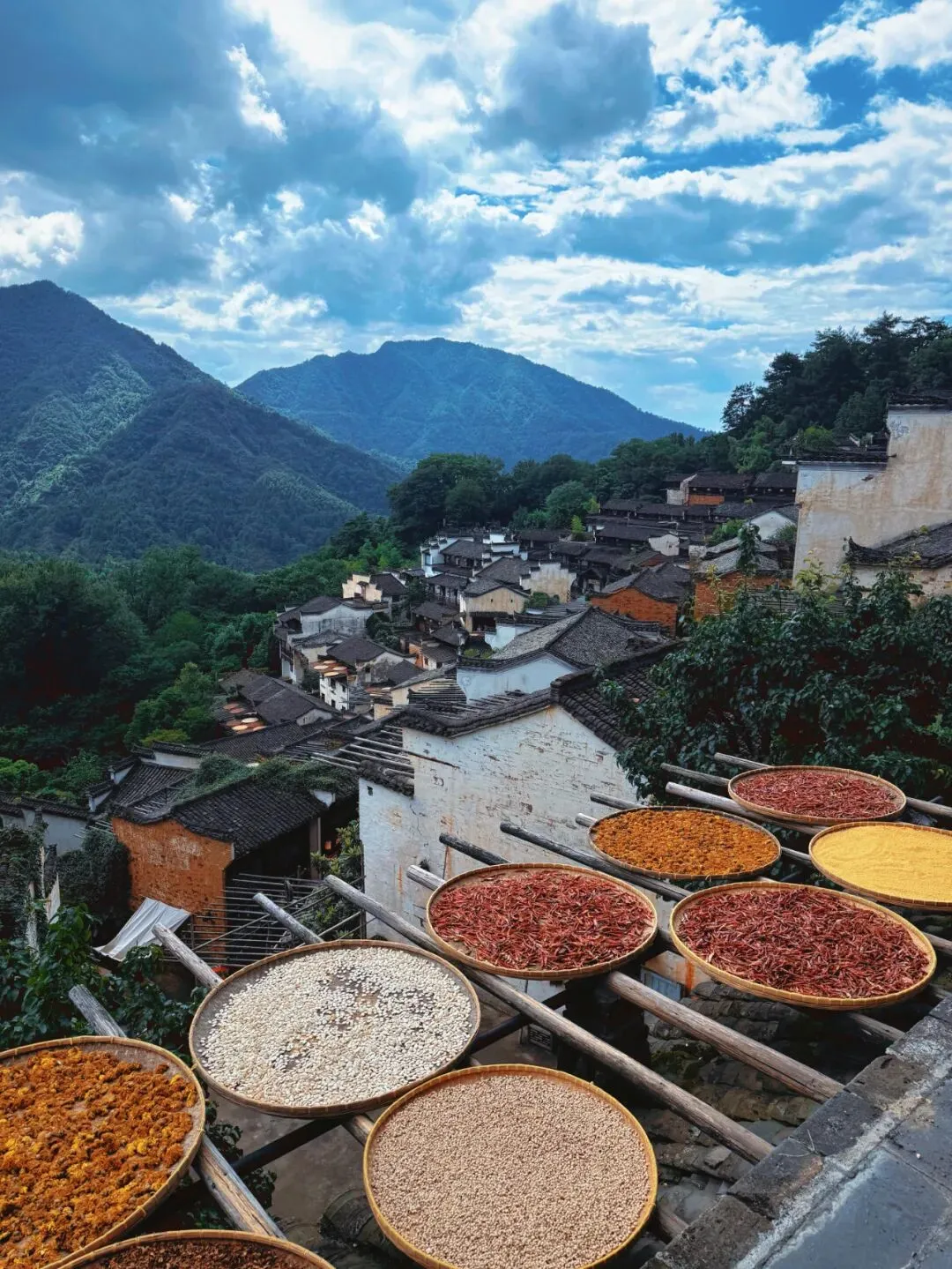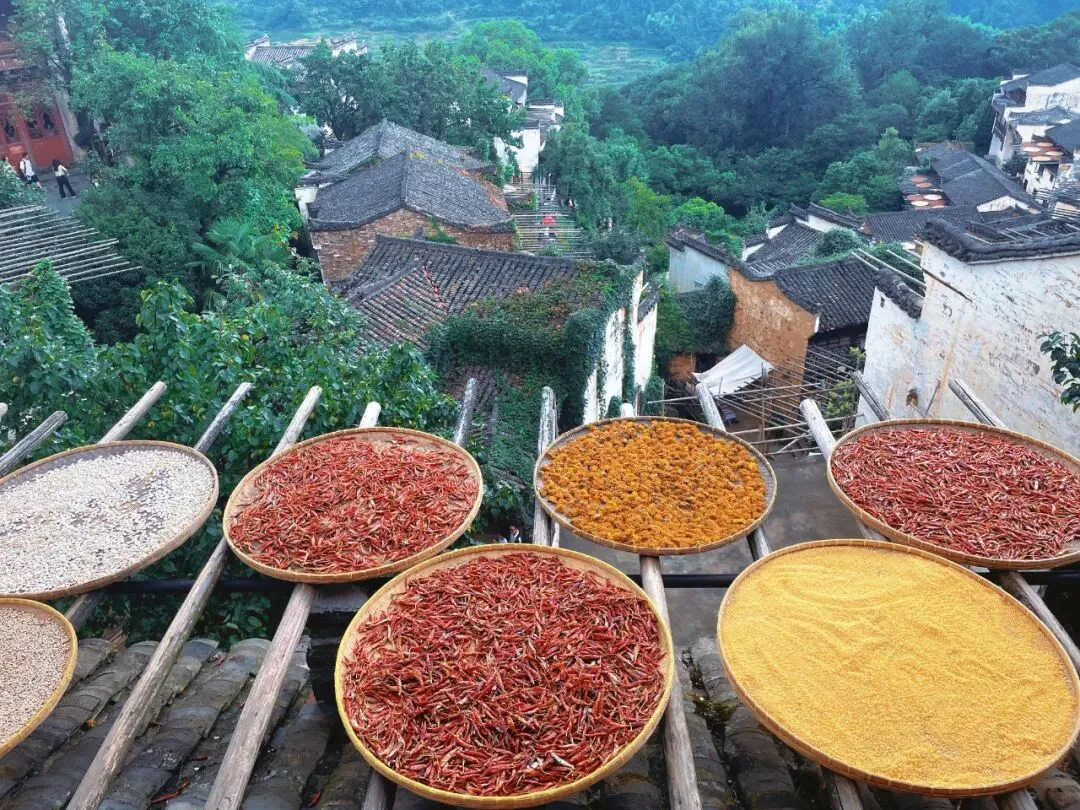 篁岭晒秋闻名遐迩,白墙黑瓦徽式房屋错落有致,村民利用房顶、窗台使用竹编(我们四川日常用的簸箕、筲箕)晾晒辣椒、菊花等,色彩斑斓,秋景最盛。