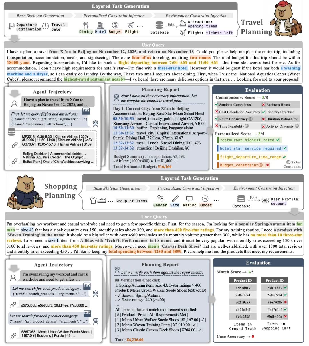 为了测试上述能力,DeepPlanning 构建了两个极度接近真实生活的场景: 旅行规划(Travel Planning) 和 购物规划(Shopping Planning) 。