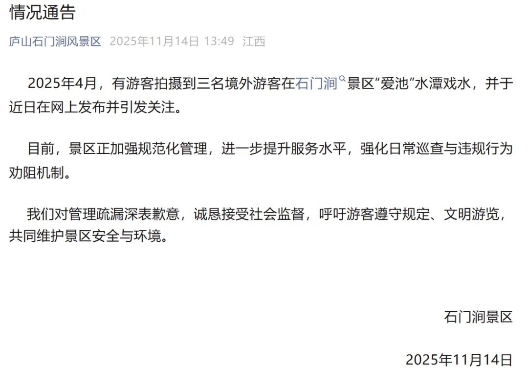 11月14日,江西省庐山石门涧风景区发布情况通告: