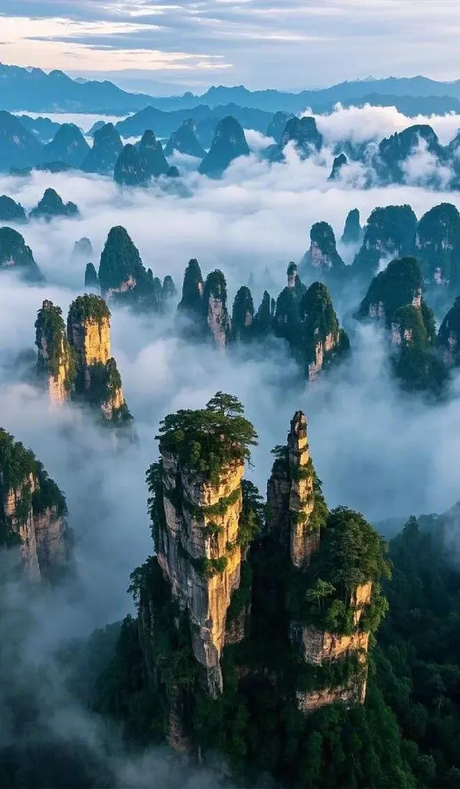 张家界峰林刺破苍穹 石峰林立 形态各异 岩壁陡峭 草木倔强地从石缝中生长 云雾缭绕时 峰林如悬浮仙境 阳光穿透云层 光柱倾泻而下 照亮岩壁的纹理 青苔覆石 增添几分苍劲 山涧流水潺潺 滋养着这片奇绝地貌