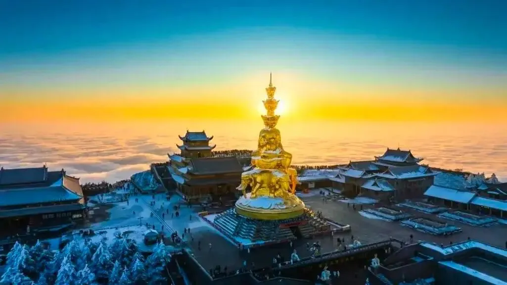 峨眉山金顶云海壮阔 佛光乍现 映着雪山金顶 寺宇庄严 香火缭绕 山间古木参天 猕猴嬉戏 溪流潺潺 石阶蜿蜒 穿过密林 直达云端 晨钟暮鼓 回荡山谷 草木的清香 泥土的气息 交织成自然的韵律