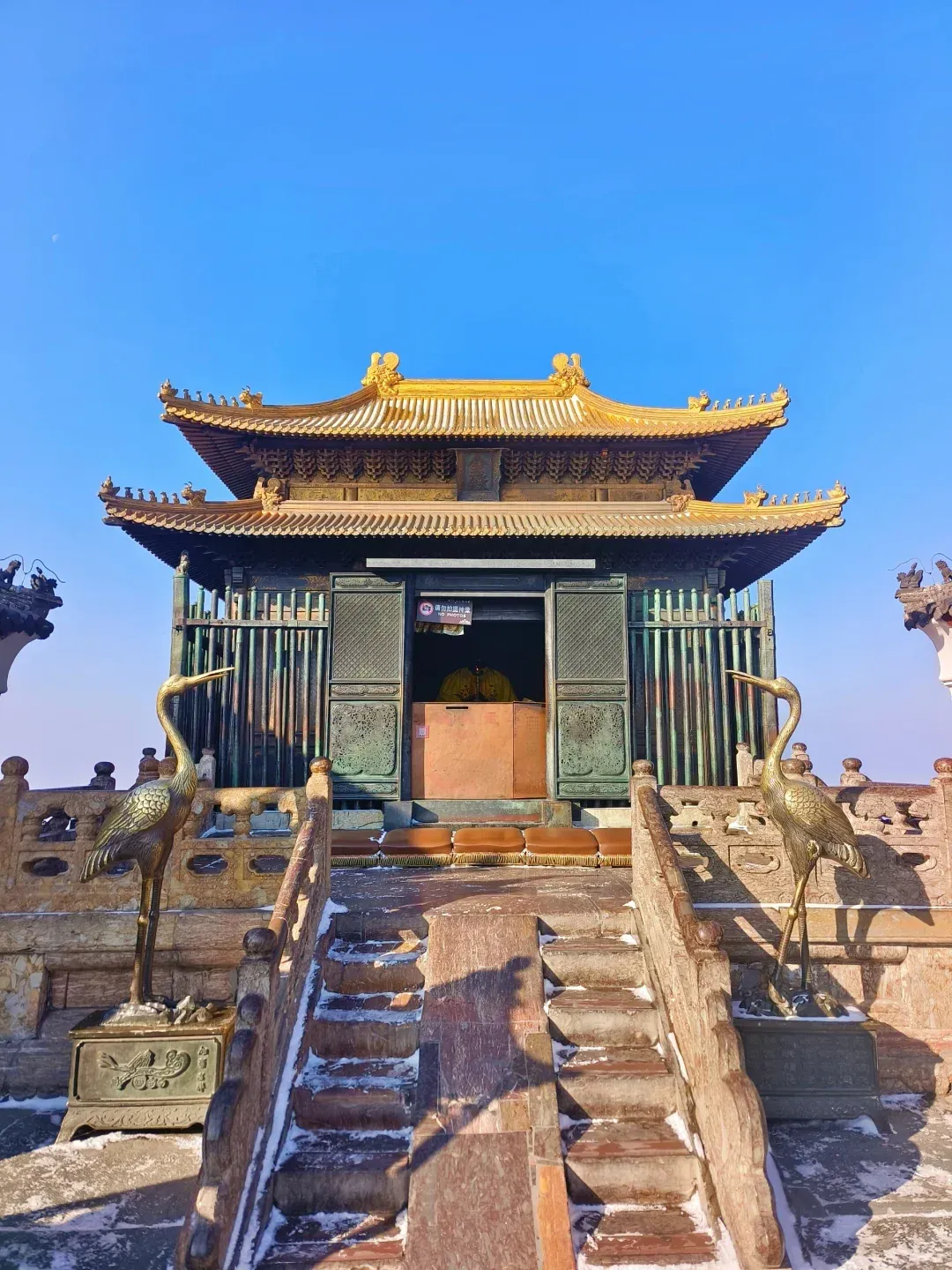 金顶是铜殿,明永乐年间铸造,万里押运上山,至今铜皮仍亮,殿里供真武大帝。