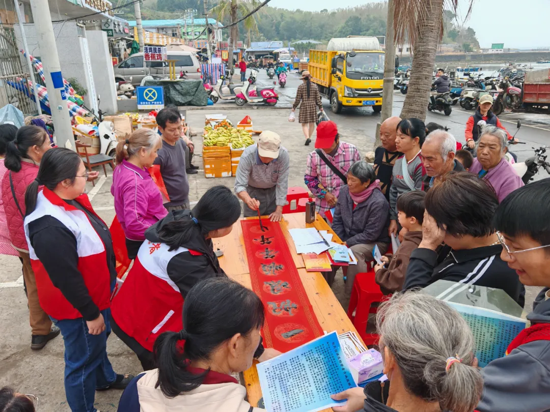 活动在涠洲镇新时代文明实践所、城仔村红色舞台、南湾市场三地同步举行,现场人头攒动,墨香四溢,热闹非凡,四方群众纷至沓来,还吸引了不少墨宝爱好者现场加入。书法爱好者们挥毫泼墨,笔走龙蛇间,一副副字迹工整、寓意吉祥的春联跃然纸上,既有辞旧迎新的美好愿景,也有平安吉祥、和谐发展的励志高歌,更有对乡村振兴、幸福生活的由衷礼赞。现场群众热情高涨,纷纷围在自己心仪的书法老师桌前,有序排队等候,或仔细品评字句寓意,或小声商量挑选内容,脸上洋溢着期盼的笑容。志愿者们主动上前搭把手,一边协助铺纸添墨、悬挂晾晒春联,一边热情地与居民交流,细致讲解春联的文化寓意与传统内涵,让大家在挑选春联的同时,加深对传统文化的了解。同时,志愿者们带着文明旅游、法治宣传、生态保护、移风易俗等宣传资料,向来往群众及附近商户发放,将文明知识与节日祝福相结合,既营造了年味,又增强了群众的文明意识。