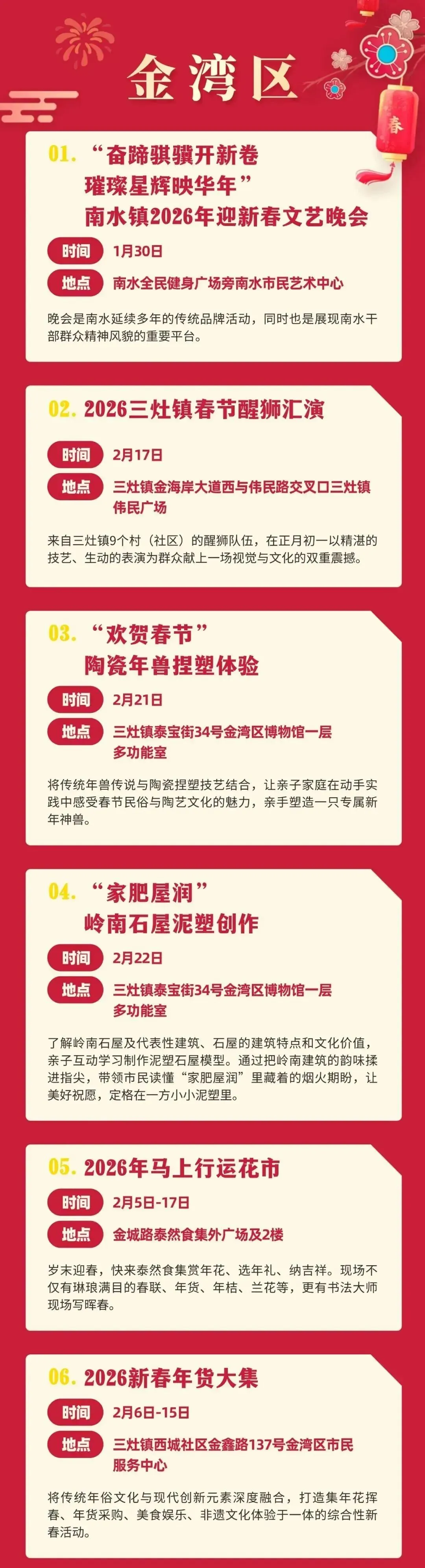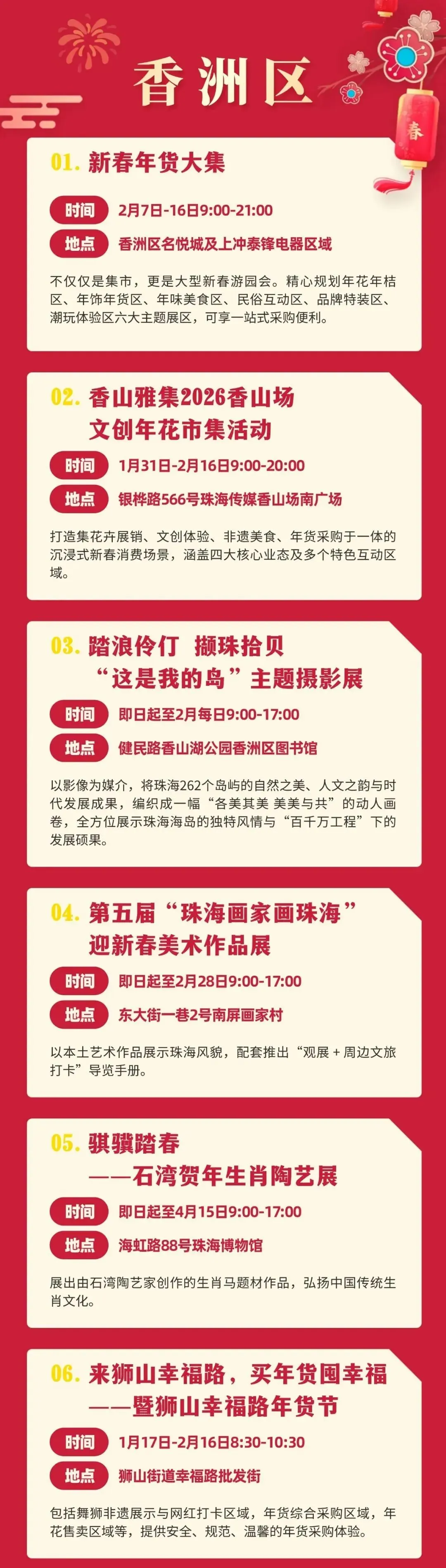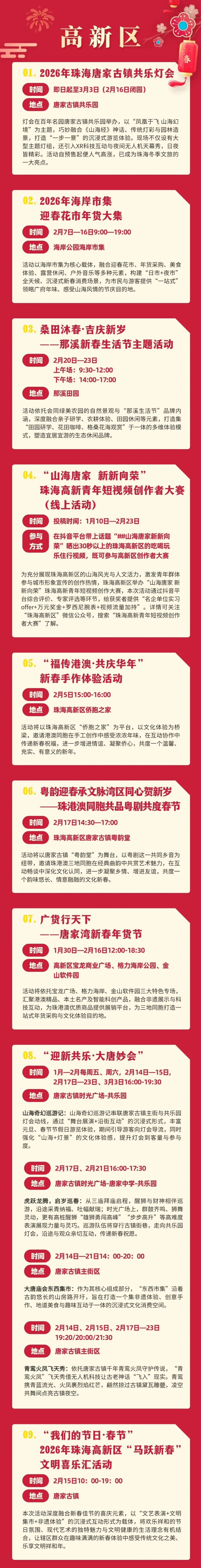 香洲区作为主城区,新春活动丰富多元,包括新春年货大集、“香山雅集”2026香山场文创年花市集活动、北山有年味、海上过大年等活动,满足不同群体需求。