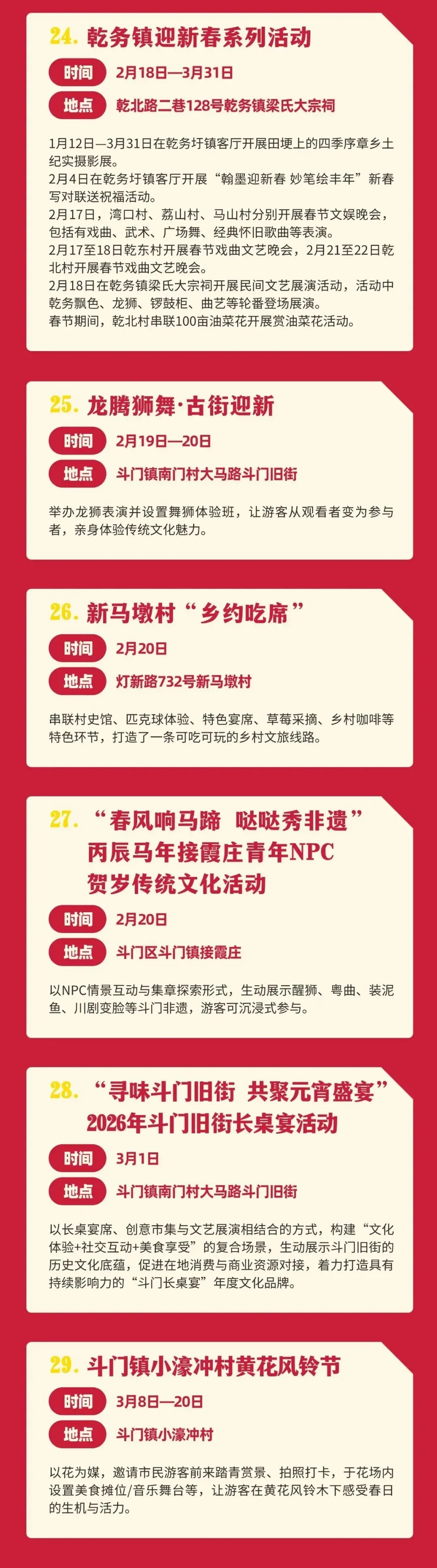 斗门区聚焦乡村年味与非遗传承,推出第二届窑鸡节、“花开水乡·鱼戏莲洲”新春系列文旅活动、油菜花旅游嘉年华等活动,让市民朋友在乡村游中感受传统年俗。