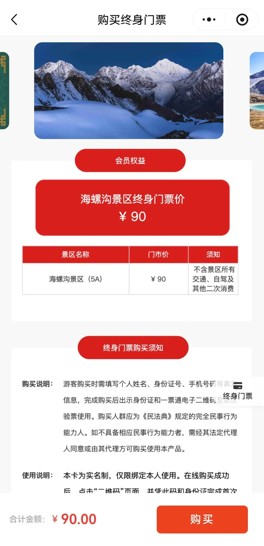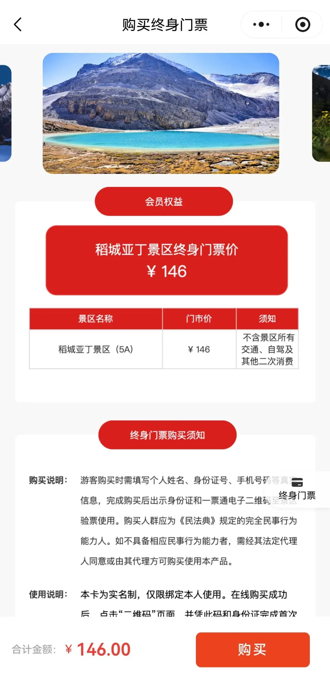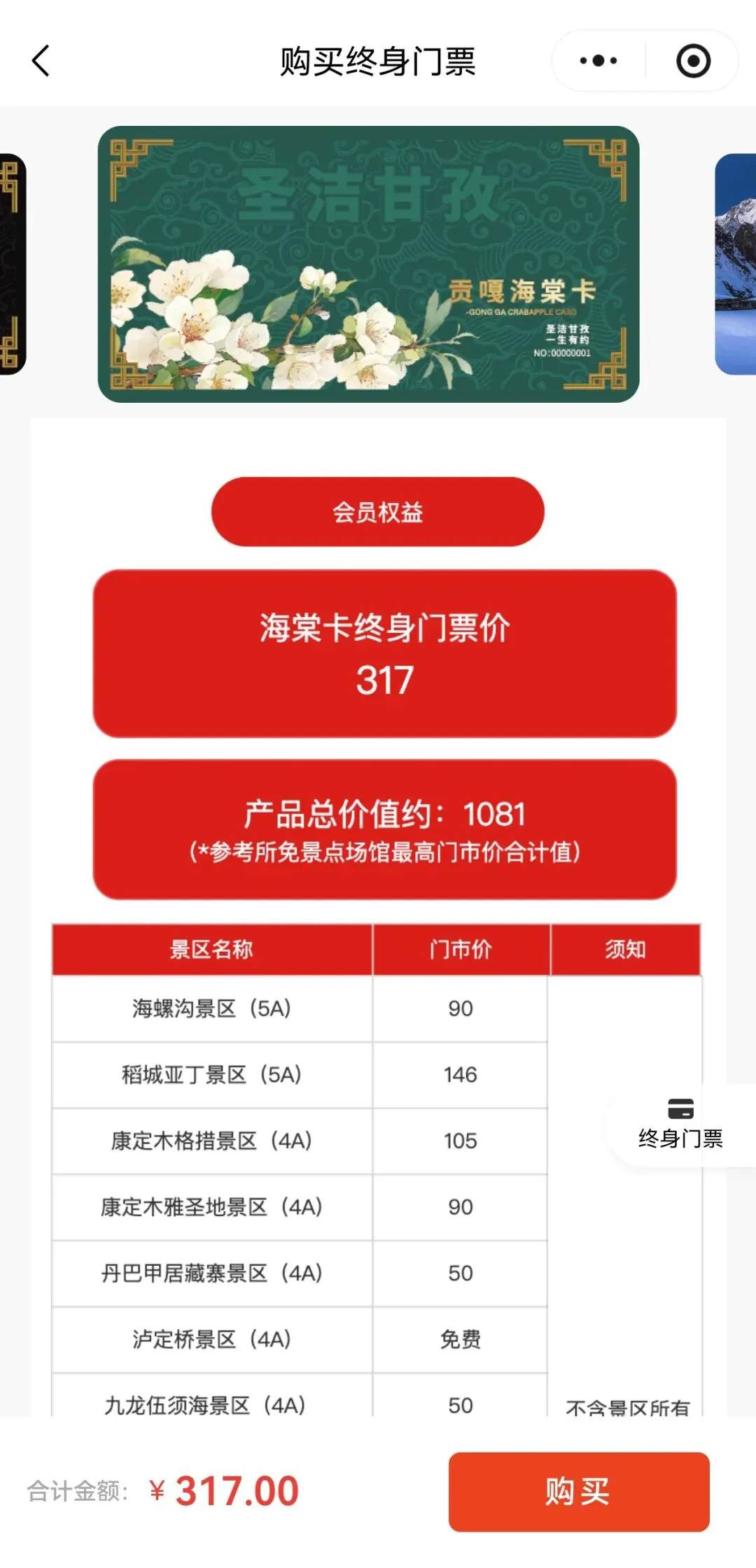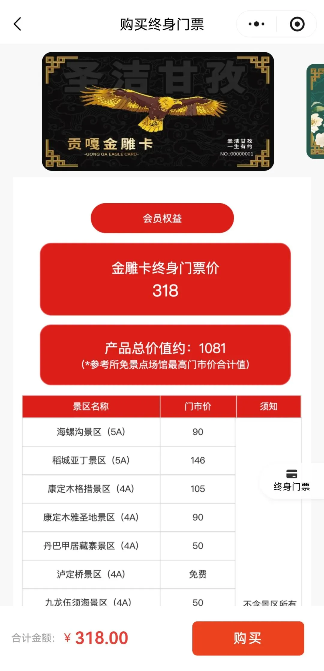 终身门票产品总价值1081元,可在微信小程序“甘孜终身门票官方平台”购买。分两种卡:贡嘎金雕卡(男士,318元),贡嘎海棠卡(女士,317元),这价格隐喻了川西境内的G318和G317两条景观大道。也可单独购买某一景区终身门票。购买后使用需绑定本人身份证,同时进行人脸识别或扫码核销,单个景区每日限入一次。
