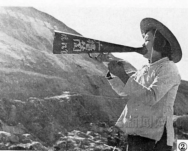 (图为工地播音员用自制的广播筒进行广播,宣传先进事迹,鼓舞民工斗志)