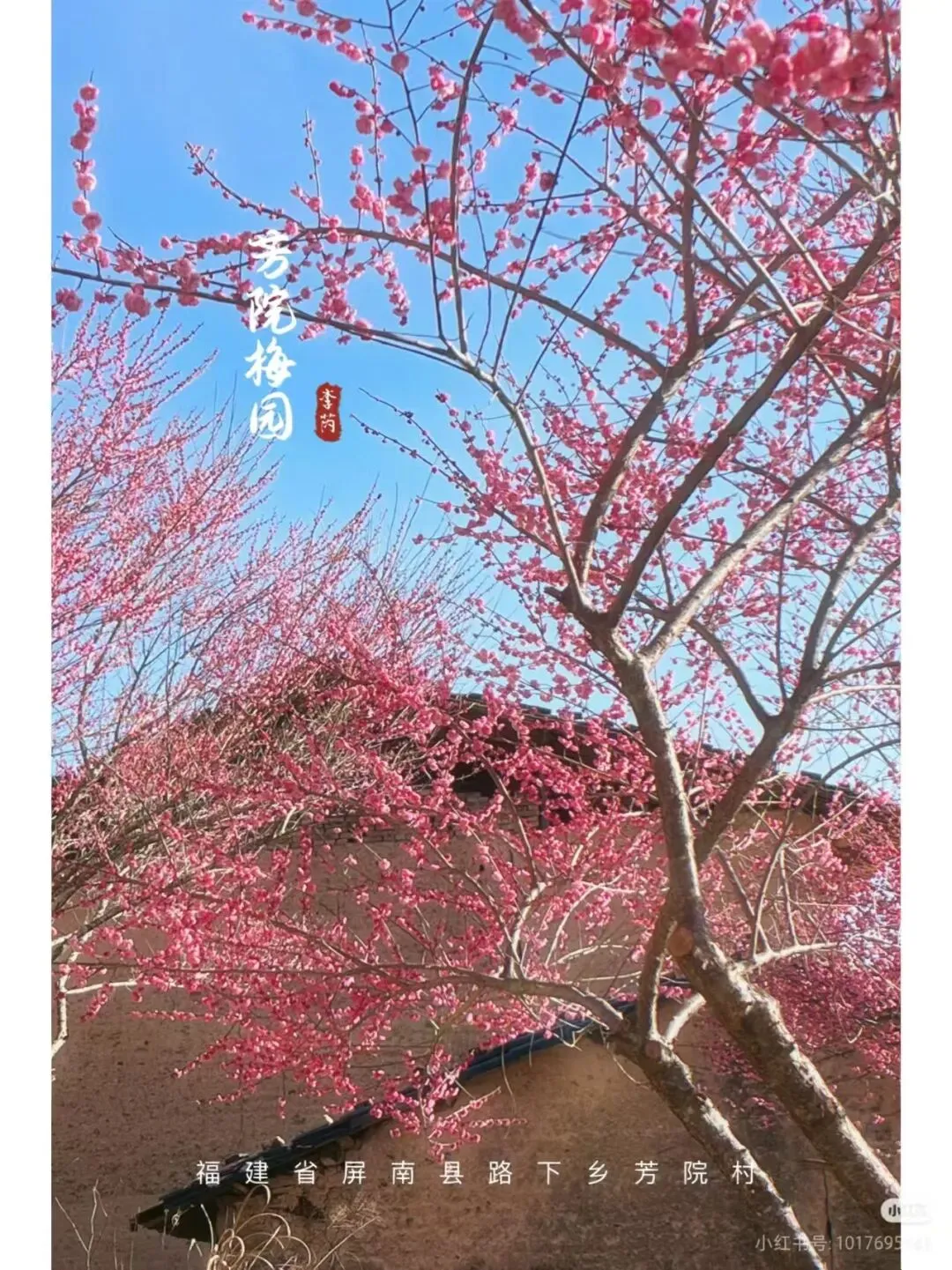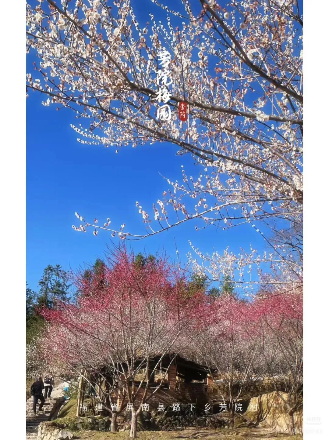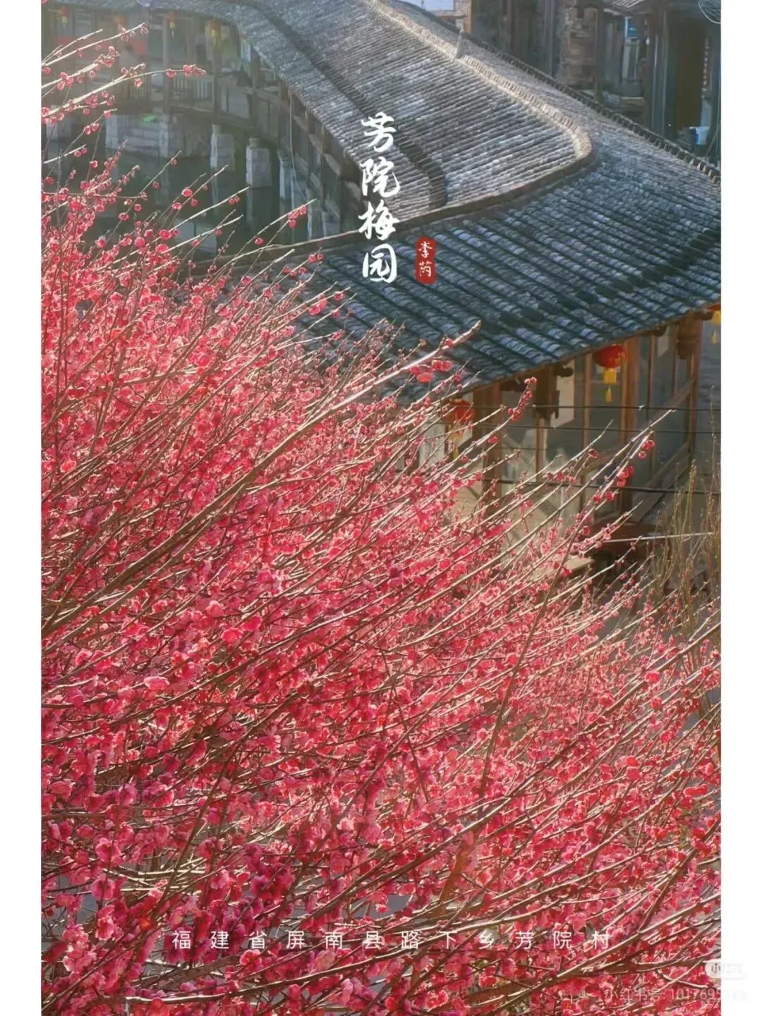 前往前往【芳院村】走进中国传统村落——屏南县路下乡芳院村,领略古村新韵,唤醒乡愁记忆:古湖建起了环湖仿古避雨长廊;明清古民居经修复鲜亮了起来;荒山变成了生态梅园,昔日穷乡村如今涌动着发展生机。远望梅林成海,近看娇艳欲滴。雨廊、古民居与梅花,浑然天成一幅山水画卷。近年来,芳院村的梅花已然成为了远近闻名的赏花打卡点之一。
