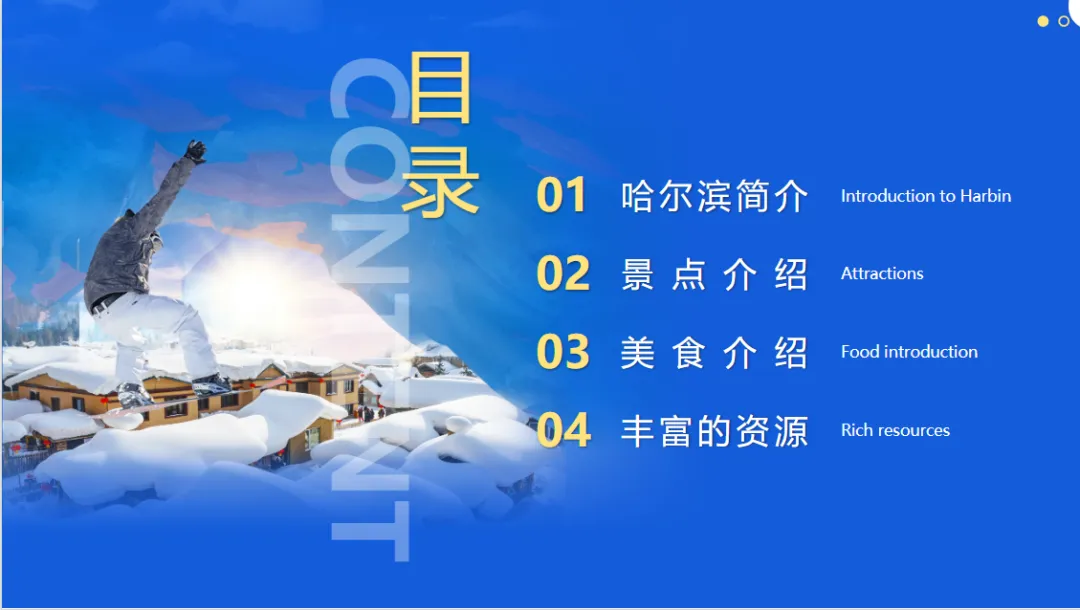 冰雪奇缘,梦幻哈尔滨——冬日里的童话世界旅游攻略PPT(免费下载)这份PPT模板的主题是“人间雪城 美丽尔滨”,以哈尔滨冬季冰雪景观为核心,结合城市文化、旅游景点与特色美食,打造一场视觉与情感并重的冰雪之旅宣传方案。