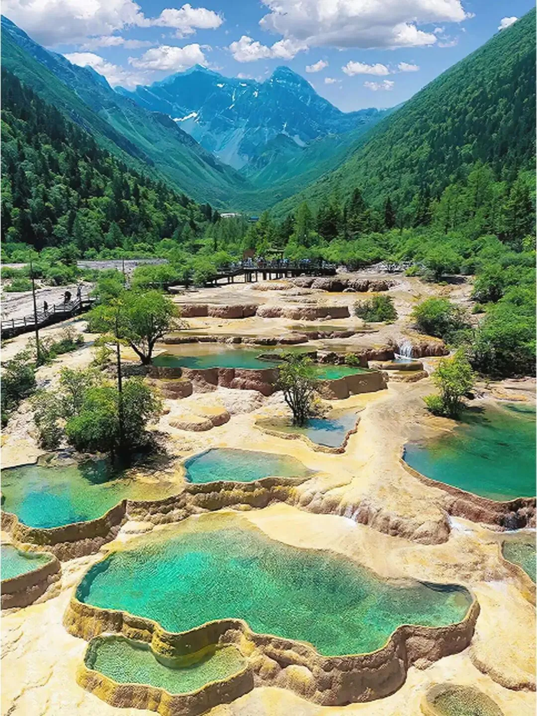 从五彩池往下走,.木.头栈道两边全是层层叠叠的钙华池,水蓝.得不像真的.。你得走慢点,池底.枯枝的.纹路.都一清.二楚,像被封在琥珀里.。海.拔有.点高,走几步喘口.气,.正好多看几眼.。水声.哗.哗的,清冽的空.气.灌进肺里,是甜的。