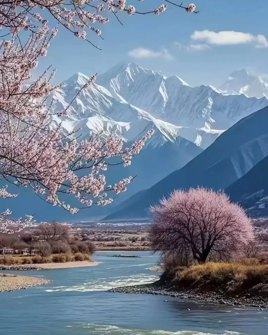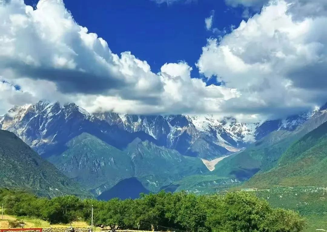 雪山全景:用广角镜头将雪山、峡谷、村庄一同收纳,展现天地之壮阔。