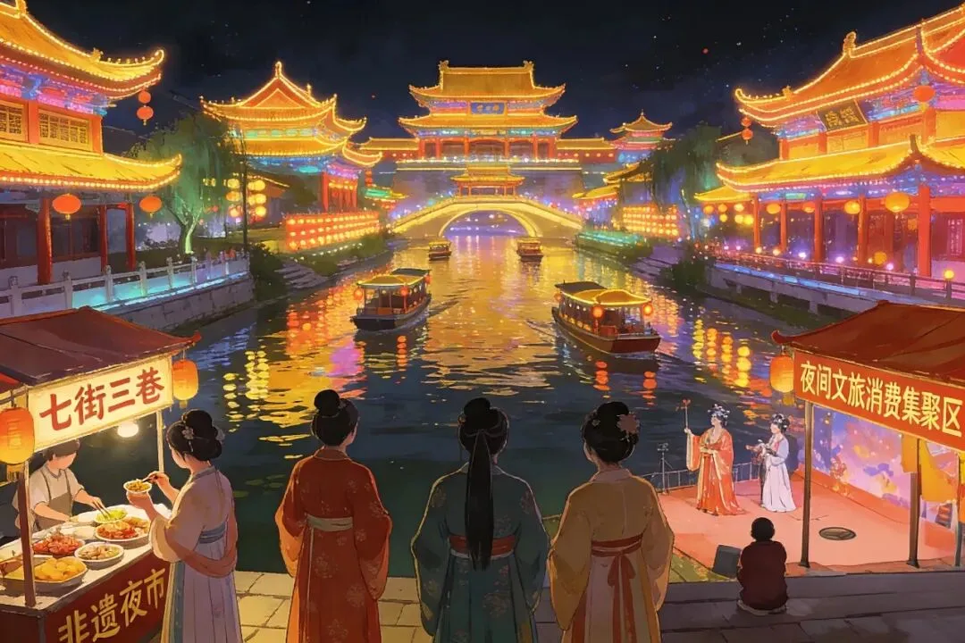 游客们身着汉服漫步在“七街三巷”中,运河画舫里传出悠扬的唱曲,非遗夜市的香气弥漫在空气里。