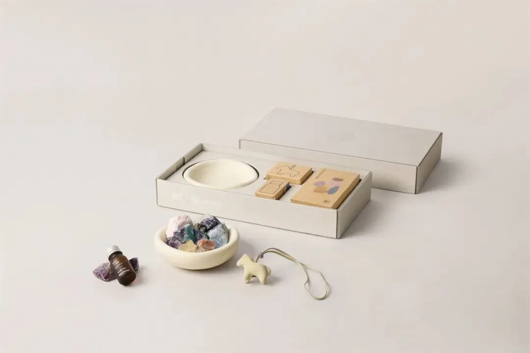 该系列特别推出6款不同主题色的礼盒,其中限定彩色款不仅含有彩色晶石,还配有生肖“小马”的扩香挂件;而常规款则以赤、白、黄、青、兰五种色彩为主,含有例如橘岩石、白体蓝月光、黄东陵等35款天然晶石,多样的色彩代表着不同的能量。