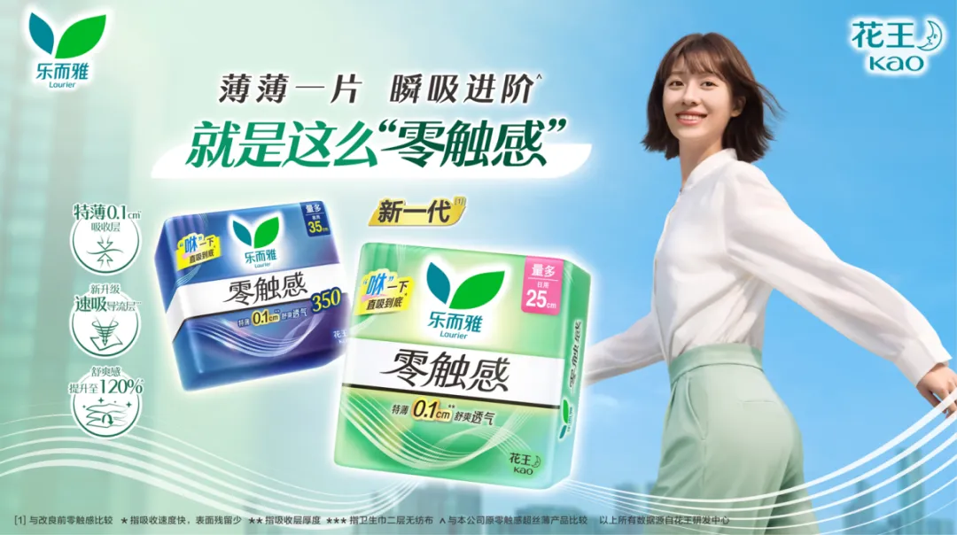 花王旗下品牌“乐而雅(Laurier)”重磅推出新一代*1“乐而雅零触感卫生巾”,薄薄一片,瞬吸进阶*1,助力女性在生理期也能开启“零触感”般体验。