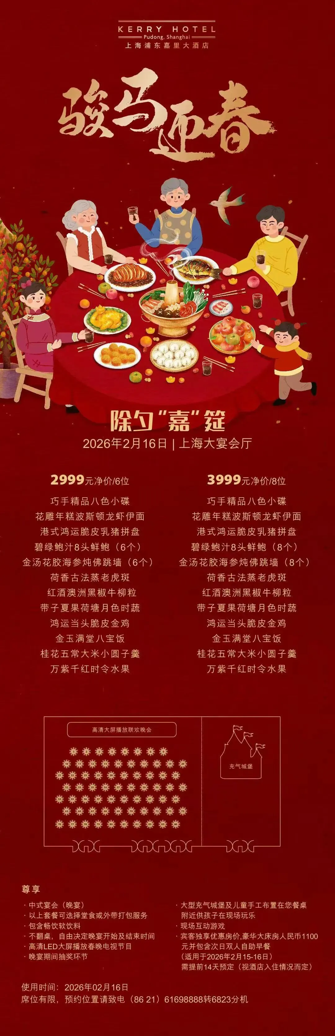除了丰盛佳肴,团圆宴更融入了多项互动与贴心安排,让除夕之夜充满欢笑与温度:大型充气城堡及儿童专属手作区:宴会厅旁设有儿童手工布置角落,让孩子们创作新春手作,增添童趣与年味。