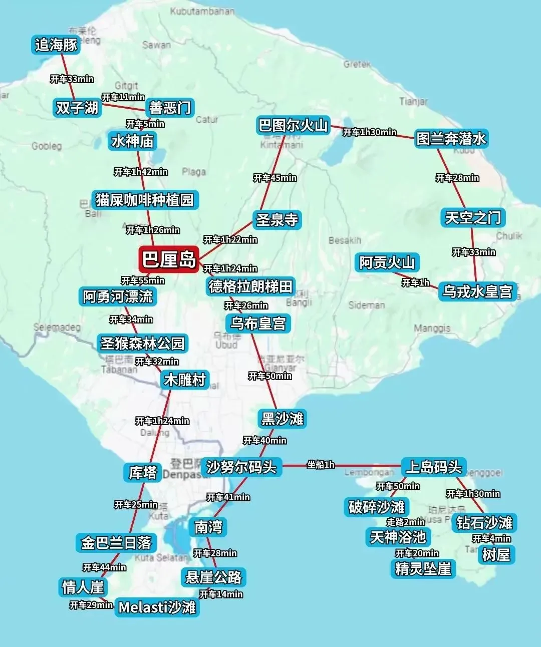 巴厘岛由于其性价比高的原因,对于游客来说,是一个非常受欢迎的选择,游客非常得多,也因此“开发”出了非常多的景点(如上图),但是我再一次强调,海岛度假不是旅行,如果预订了奢华酒店,最佳的度假方式便是在酒店享受,每天安排1-2个景点参观或者安排一天游览即可。