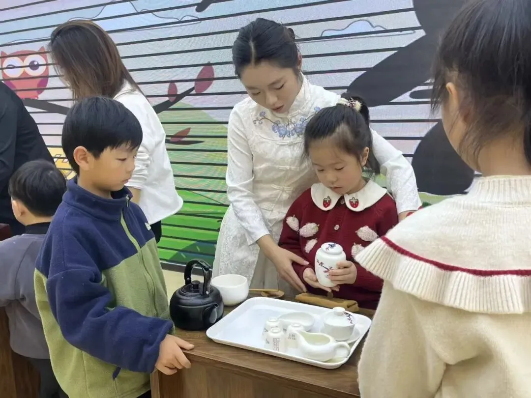 开班仪式上,志愿者代表分享了参加“青旅红”志愿服务活动的感悟,表达了对红色文化的热爱。研学小课堂开班第一课是“体验茶艺冲泡”。课堂上,志愿者发挥专业优势,带来了精彩的茶艺展示,温杯、置茶、注水、出汤等一系列操作娴熟优雅,行云流水间尽显韵味,同时详细讲解了茶叶的分类、冲泡技巧、茶文化的历史渊源等知识,让大家在缕缕茶香中,深入了解中华茶文化的博大精深。展示结束后,小朋友们热情高涨,在志愿者的细致协助下亲身体验泡茶流程,与志愿者一同感受中华茶文化的独特魅力,在温馨互动间浸润茶香与文化底蕴。