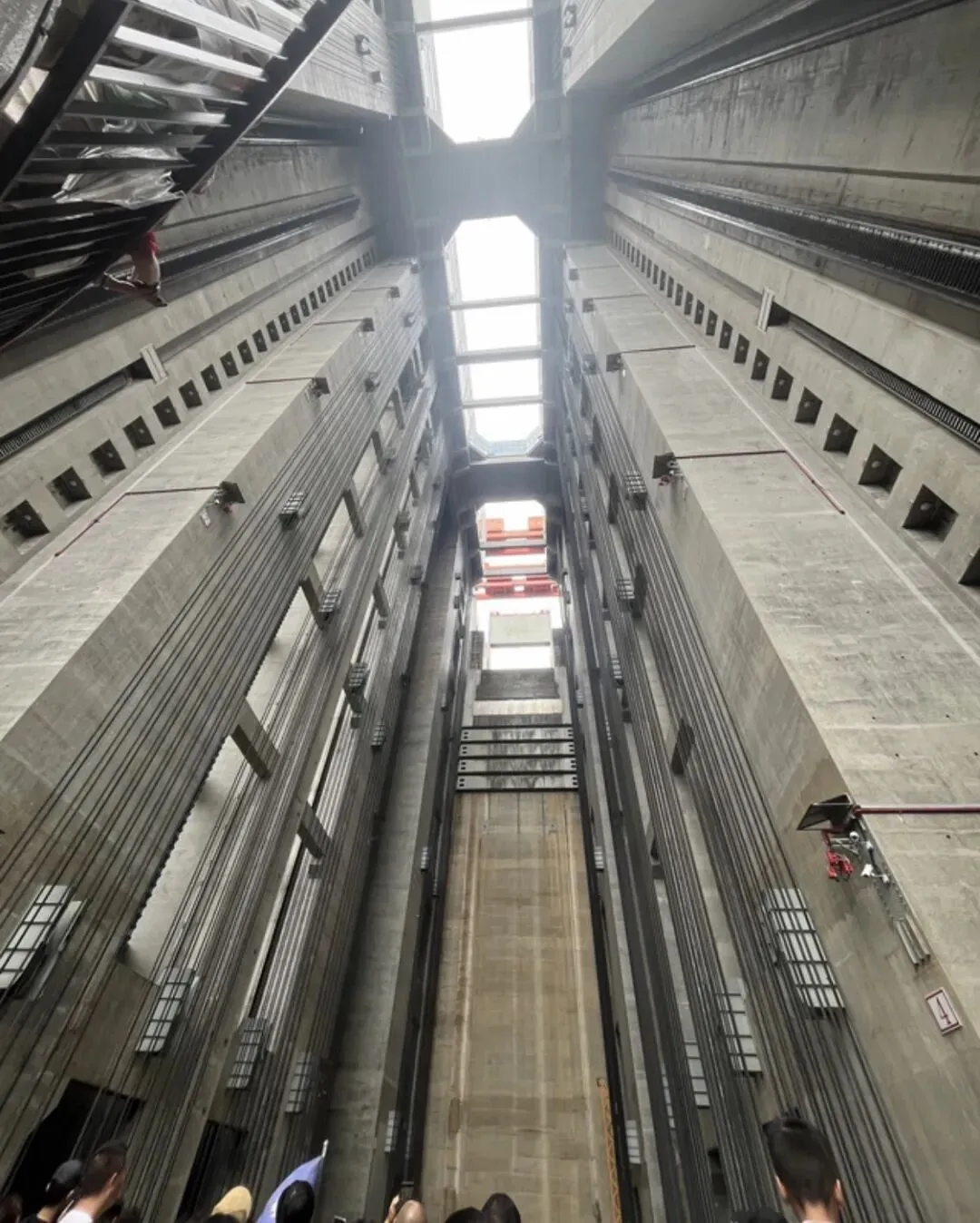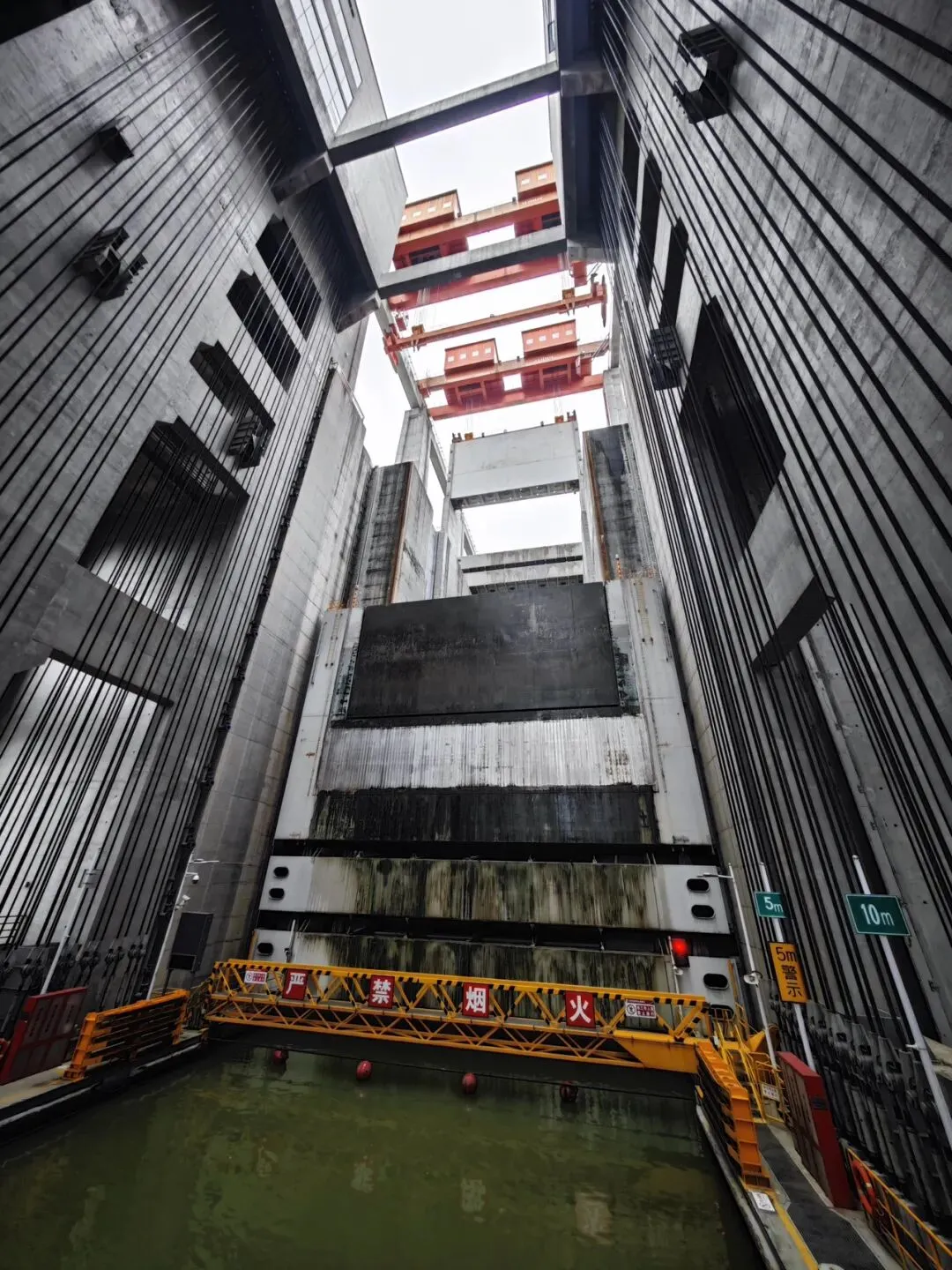 我们的游船缓缓驶入了升船机,就像是开进了一座大楼里面。游客们纷纷来到了甲板上,周围的工作人员一顿操作猛如虎,然后,我们的船开始缓缓下降了。