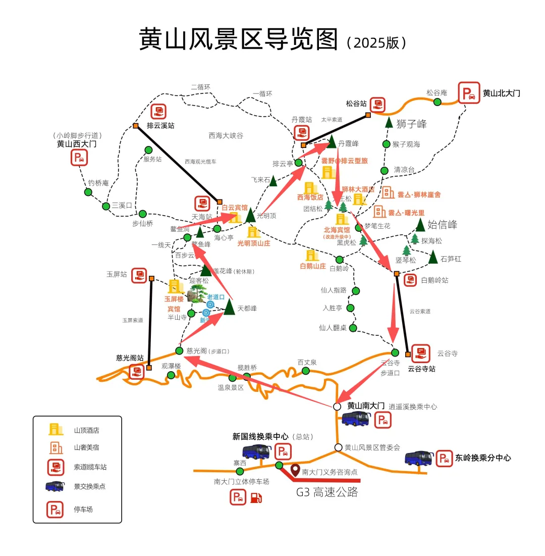 必须提前预约,节假日更需提前 2-3 个月 :关注 "黄山天气" 公众号,暴雨天可能临时关闭索道和西海大峡谷 逆时针走(从排云亭→一环→二环→缆车)