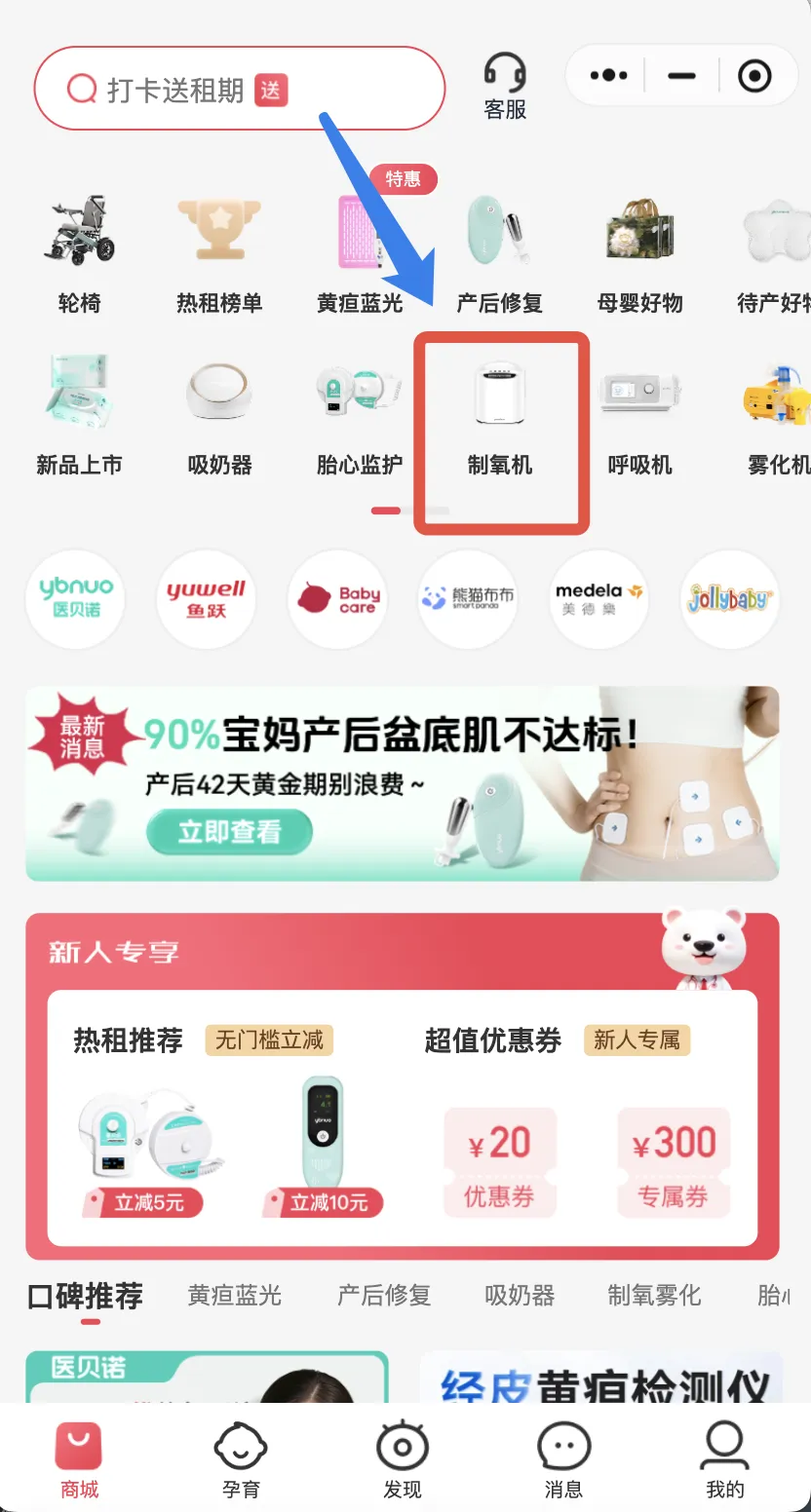 1.在微信搜索医小租小程序,进入主界面,点击“制氧机”,进入“制氧机”产品专栏。