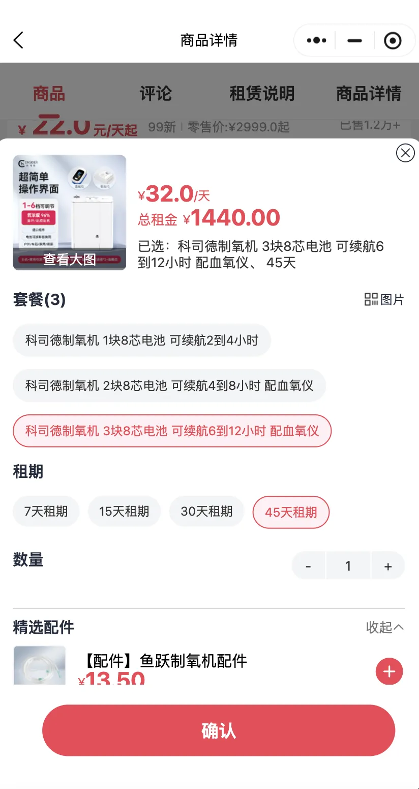 平台租赁的科司德制氧机均是官方品牌直供,租期灵活,芝麻信用免押金,租用时间越长,越划算,每日租金相当于一杯奶茶钱。