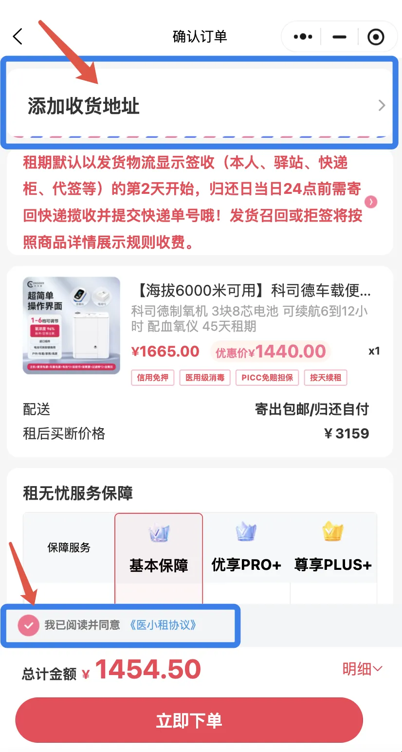 4.点击确认后跳转到“确认订单”页面,添加租赁地址,仔细了解租赁规则,勾选底部阅读协议后点击立即下单。