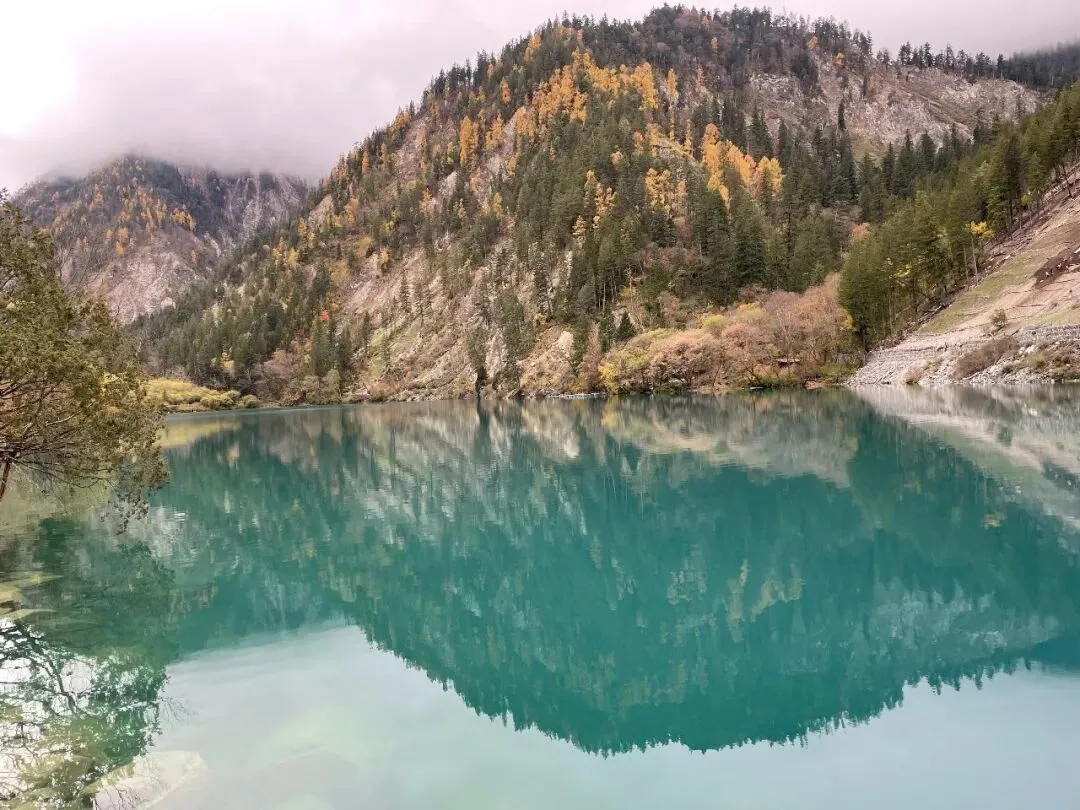 走着走着,我们就到了熊猫海。近处的山顶一缕似散未散的云雾,远处的山顶被一团云雾遮住。树林色彩斑斓,海子蓝蓝的,水面宽阔,宽阔得让人的心胸也更宽阔了。微风拂过,水面荡起阵阵涟漪,泛起星星点点的光。