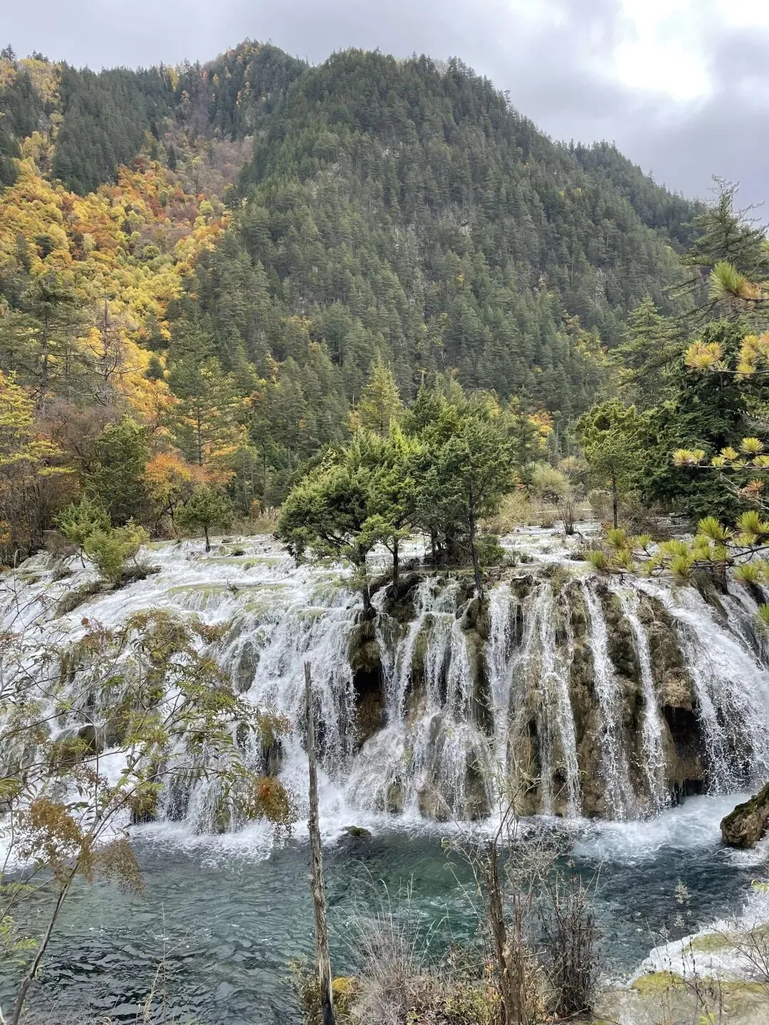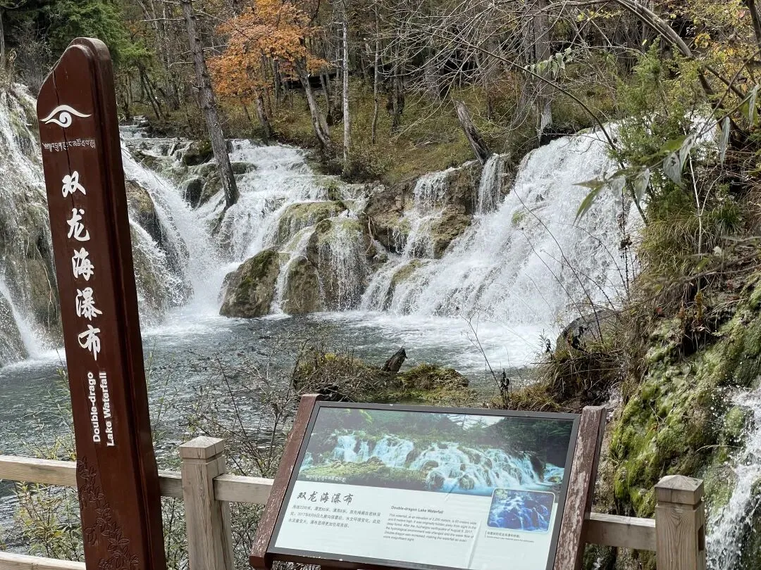 双龙海与火花海相隔不远,我们不多久就看到了双龙海瀑布。九寨沟的水果然名不虚传。