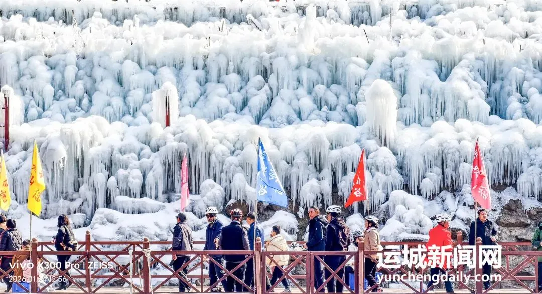 热闹的年俗表演过后,果老仙谷的冰雪奇景成为游客眼中的主角,25亿年地质演化形成的变质岩与山间晶莹的冰挂相互映衬,冬日的山谷宛如一幅灵动的冰雪画卷。昔日奔涌的30余处飞瀑在冬日里凝结成冰,崖壁上垂挂着形态各异的冰帘、冰柱,阳光洒下时,冰层折射出透亮的光影。不少游客伸手轻触冰凉的冰凌,感受着冬日独有的清爽,纷纷拿出手机、相机记录眼前的美景,直言“年味十足,惊喜满满,不虚此行”。