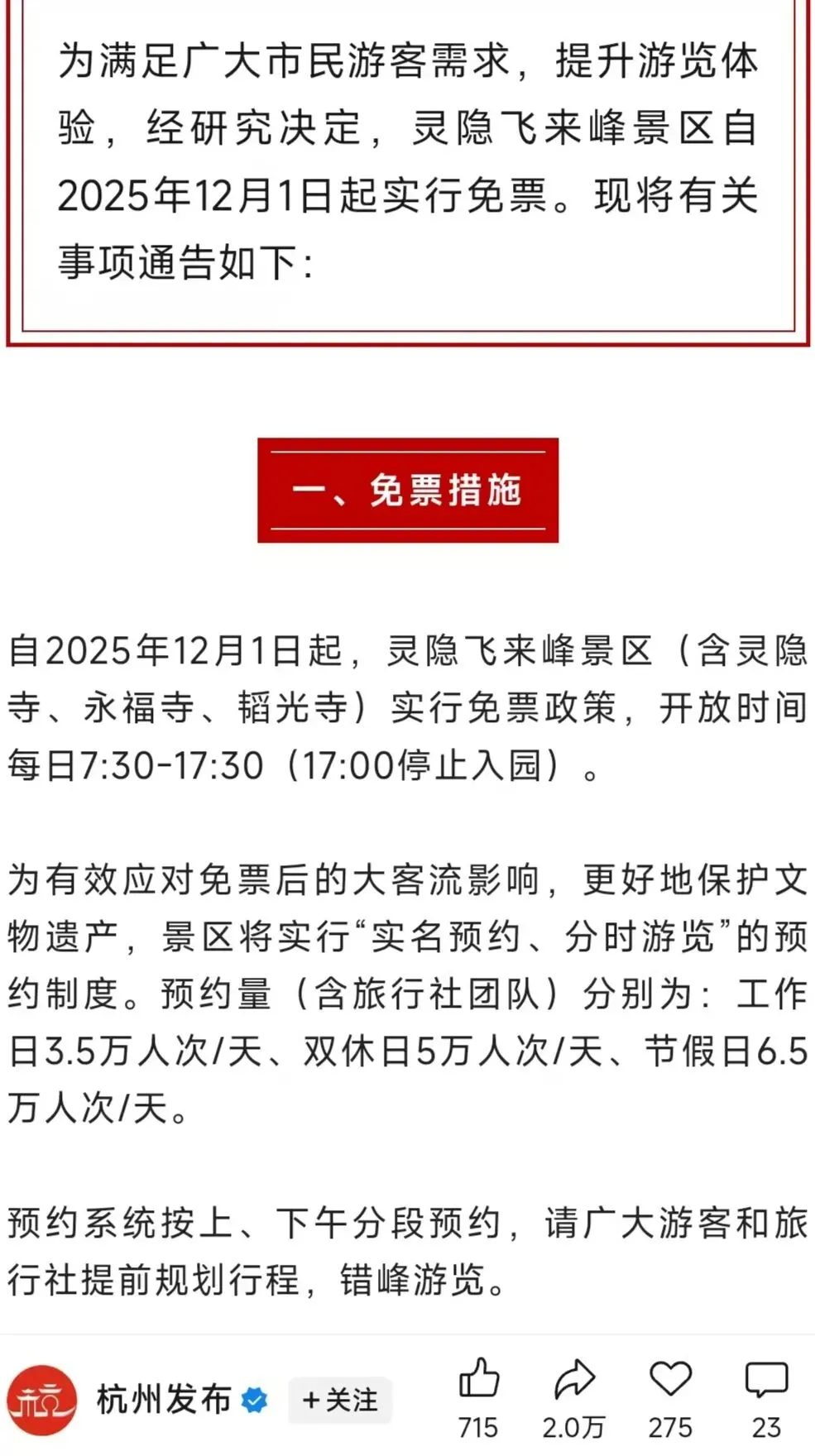 灵隐寺、雷峰塔需“西湖旅游”公众号预约,周末提前3天。
