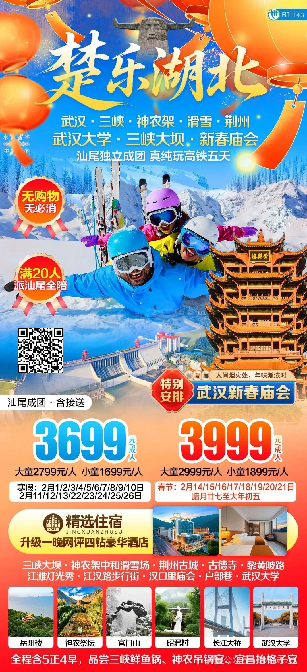 【携程旅游】2月9日出发3699元/人(已成团)→【楚乐湖北】武汉+三峡+神农架滑雪·高铁往返真纯玩5天游