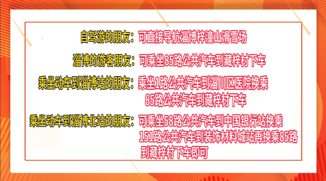 在淄博齐乐梦华梓橦山滑雪场,不仅能释放激情与活力,更能让人们的心灵在寒风中感受到独特的温暖。自驾游的朋友可直接导航淄博齐乐梦华梓潼山滑雪场,淄博的朋友可乘坐85路公共汽车到藏梓村下车,乘坐动车到淄博站的朋友可乘坐1路公共汽车到淄川区医院换乘85路公共汽车到藏梓村下车,乘坐动车到淄博北站的朋友可乘坐58路公共汽车到中国银行站换乘151路公共汽车到装饰材料城站再换乘85路到藏梓村下车即可。