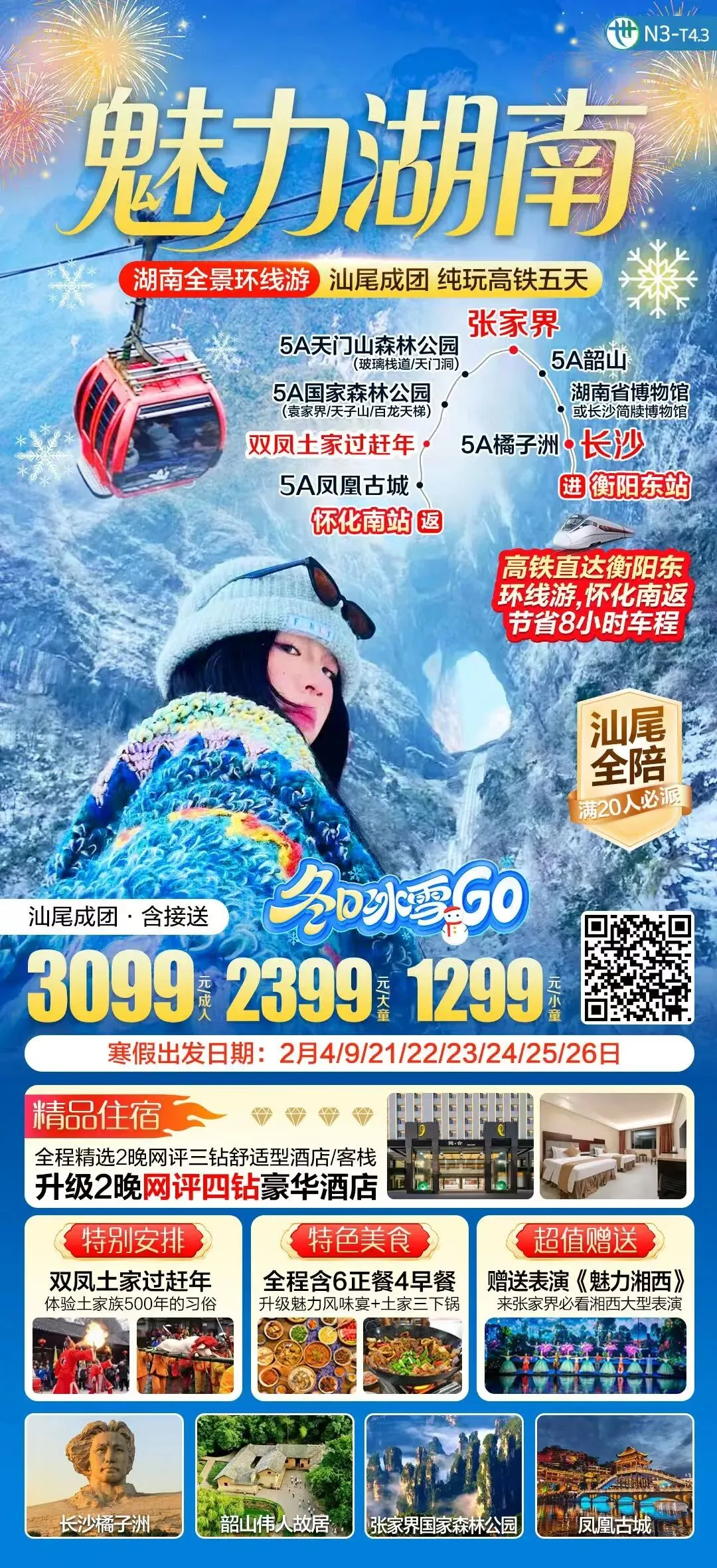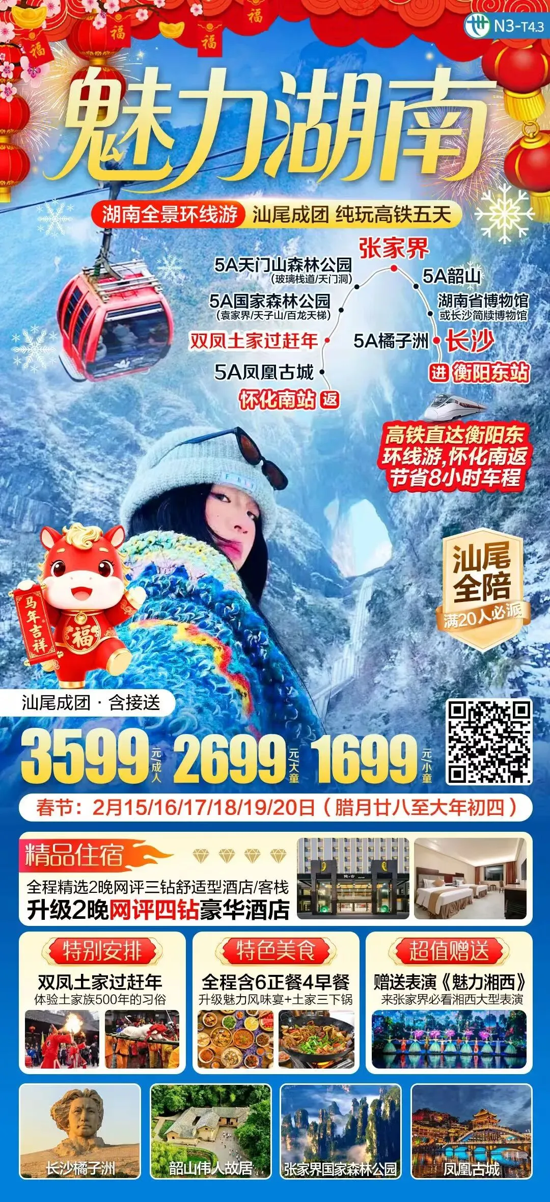 【携程旅游】2月9/15/17/18/19号铁发→畅游长沙橘子洲•韶山•张家界72骑楼·天门山•纯玩高铁5日游