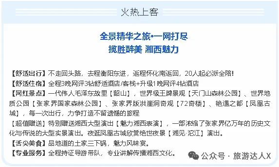 7. 购物安排:全程不安排超市特产店,也不安排指定购物店。另某些景区内部特别是湘西凤凰、溪布街内可能有商店、特产店、士多店等等,不属本行程安排购物店范畴,敬请知须!旅游用车司机可能有兜售自家产腊肉等特产行为,属当地所有旅游车普遍性正常现象,可自由选择,报名前须知!