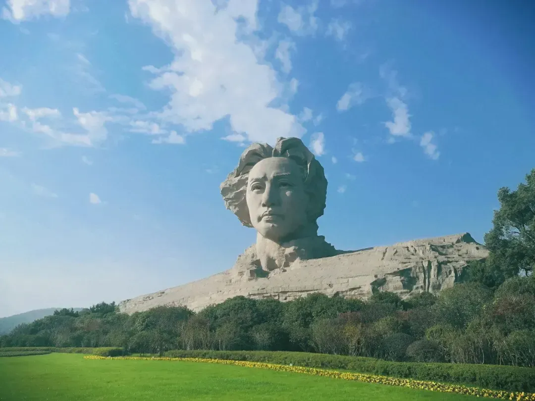毛主席铜像是按主席大典上的形象设计,重 3.7 吨,高10.1 米,象征中华人民共和国成立于10 月 1 日。铜像座西南、朝东北,主席身躯伟岸,双手握书卷,身着中山装,双眼炯炯微露笑容。