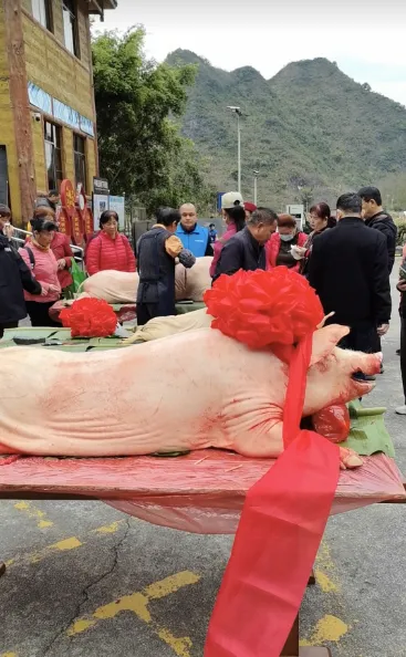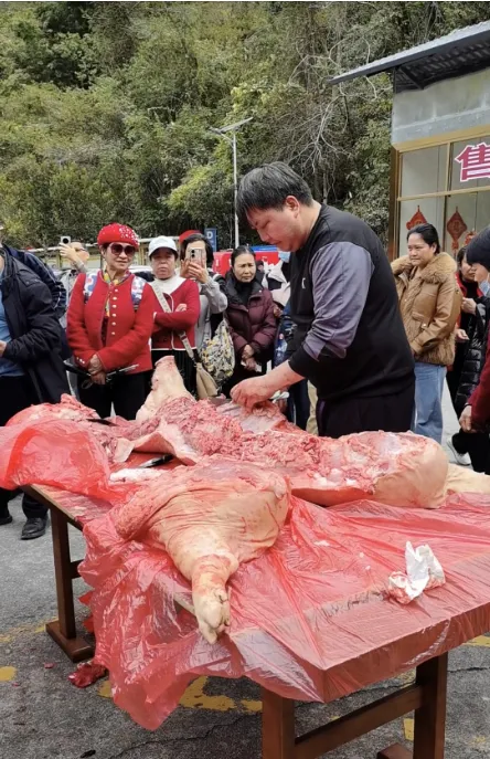 平果通天地下河景区将传统杀猪宴与景区独特的喀斯特暗河地貌相结合,打造了一场“在暗河边赏奇观,于烟火中品年味”的特色活动。活动当天,景区餐厅前支起柴火大灶,本地散养的土猪现宰现烹,猪血汤、爆炒猪肝、红烧肉等佳肴香气四溢,一百张圆桌整齐排列,千余名游客围坐共餐,欢声笑语与溶洞回音交织,尽显乡土温情。